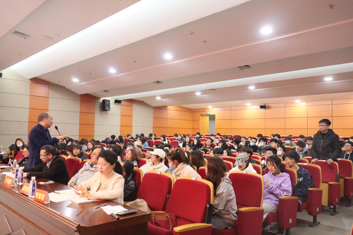 推进会伊始,高利新经理提出成功的四大要素“目标,使命感,时机,努力”,并围绕“学习与考研”向同学们介绍了预习复习的方法以及考研的流程,帮助同学们更有效率地学习,也使同学们对考研有大致的了解,对未来有所规划。不同的专业,学习的方法也不同,英语专业需要阅读和积累,而数学专业需要做题与思考。正如高经理给予同学的激励“无论你是狮子或斑马,正确的选择都是奔跑”,我们应当奔跑起来,追赶时间,追求卓越!之后,黄忠裕老师为同学们讲解“教资考试与教师应聘”这一大家都十分关心的问题。针对现阶段教资考试难度提升,黄老师分享了教资笔试面试的题目以及备考经验和注意事项,提醒同学们关注重点,准备充分。紧接着,于恒国老师向同学们展示了公司往届毕业生就业情况,解读了考研与就业的相关问题与政策,帮助同学们未来在实习与就业的道路上,拥有更好的选择。此外,于老师提出“准备考研和就业时间并不冲突”,鼓励同学们“一个红心,两手准备”。