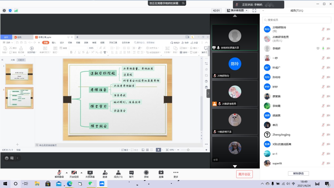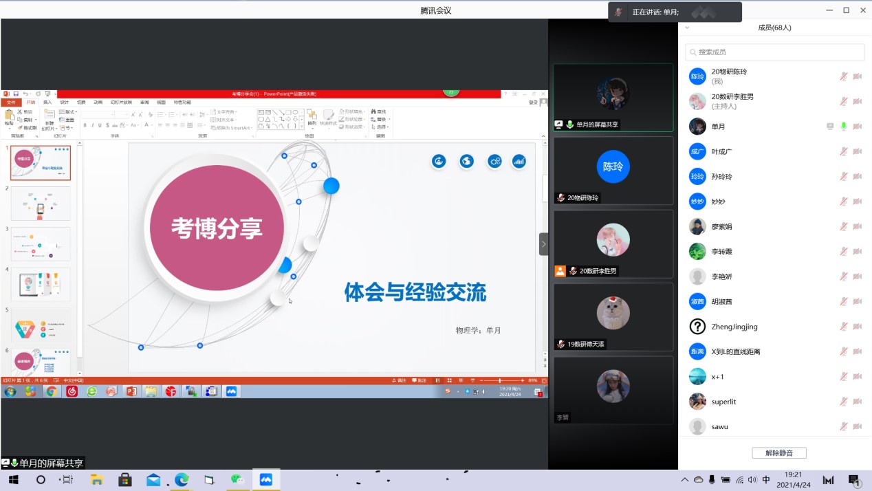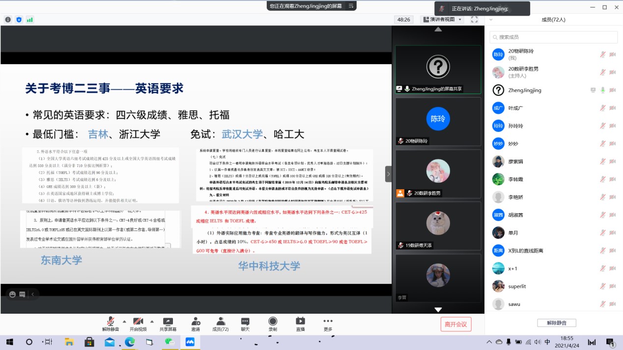 为充分发挥博士院友对公司研究生考博的示范和带头作用,营造良好的学术氛围。2021年4月24日,3044永利研究生会通过腾讯会议APP以现场直播的方式,举办研究生考博经验交流分享会,邀请考博成功的3位院友,河海大学2020级博士李艳娇、纽芬兰纪念大学2020级博士郑晶晶、南京大学2020级博士单月分享她们的考博经验,本次活动在线参与人数近80人。