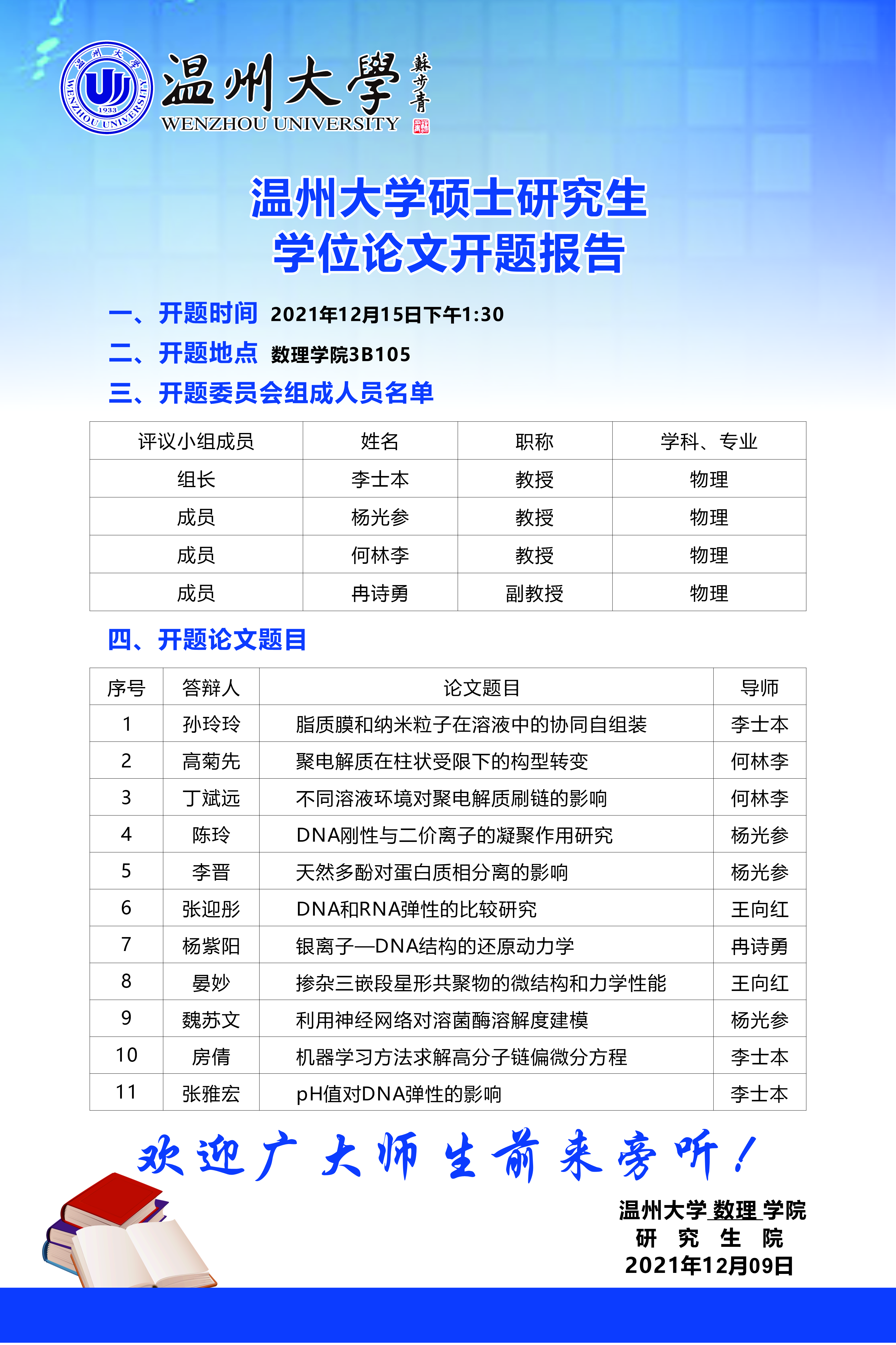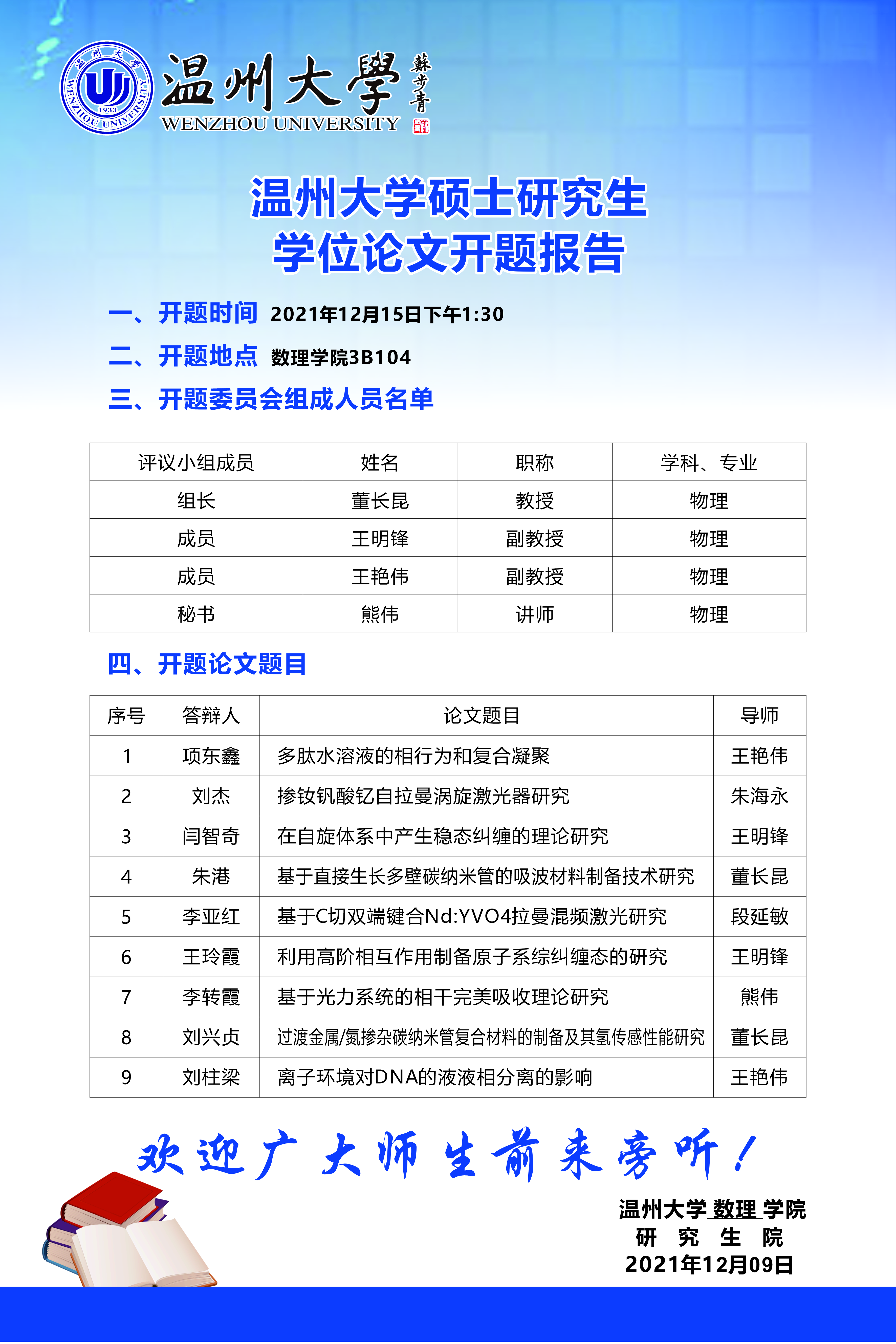 3044永利2020级(物理学)学术型硕士研究生学位论文开题报告信息公告