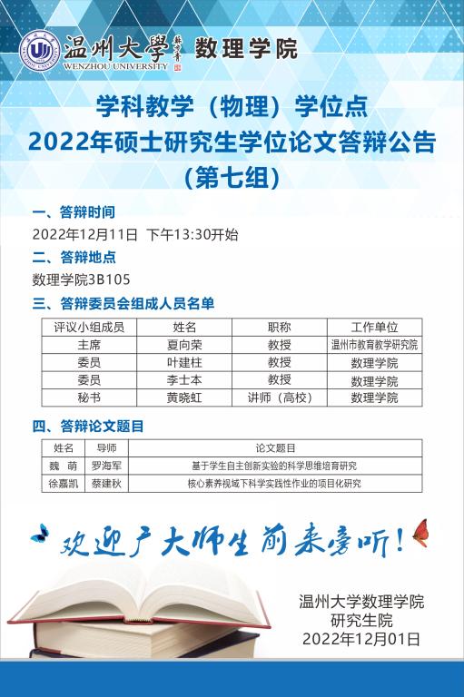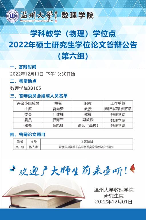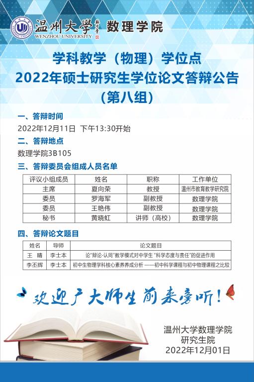 3044永利学科教学(物理)学位点2022年硕士研究生学位论文答辩公告