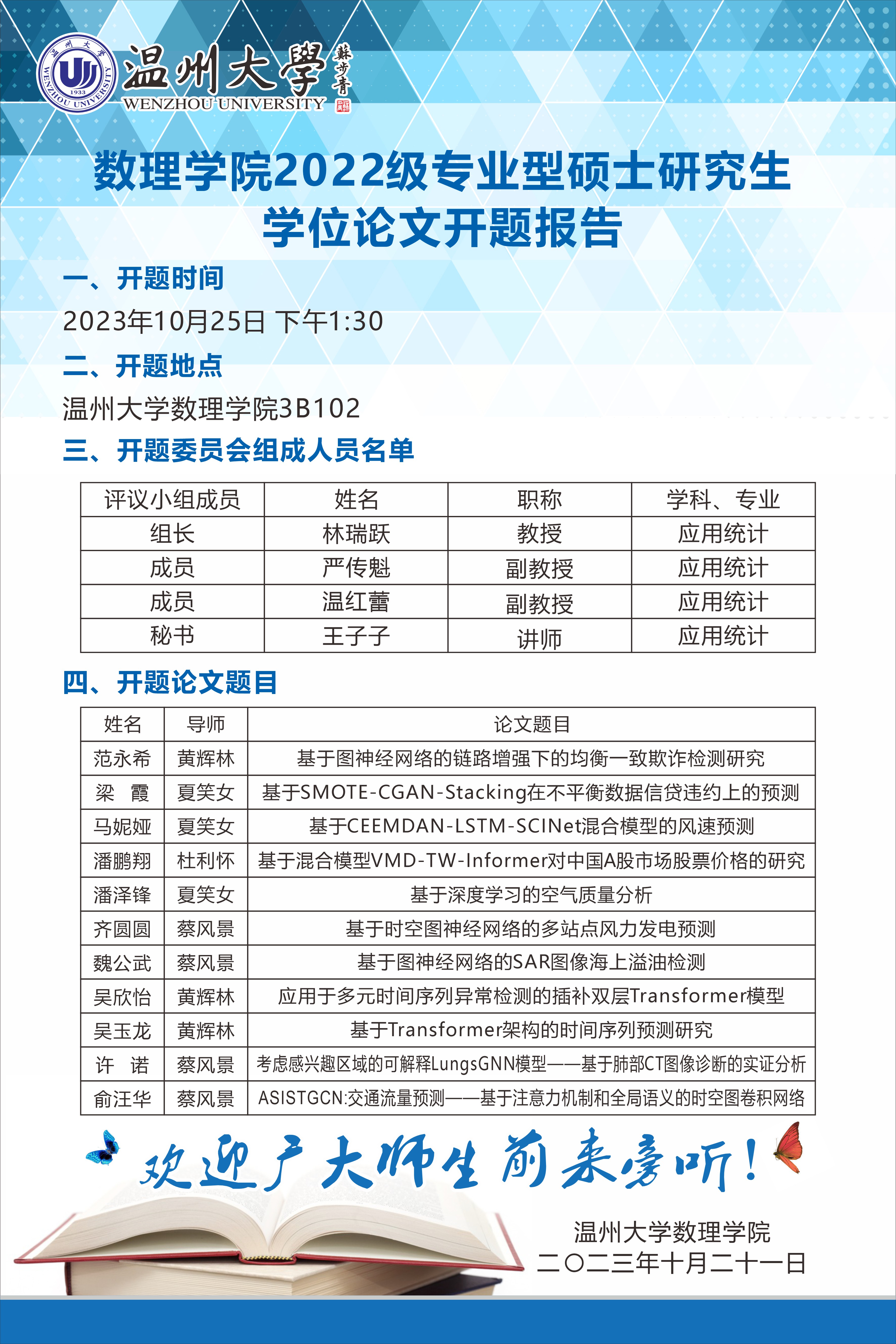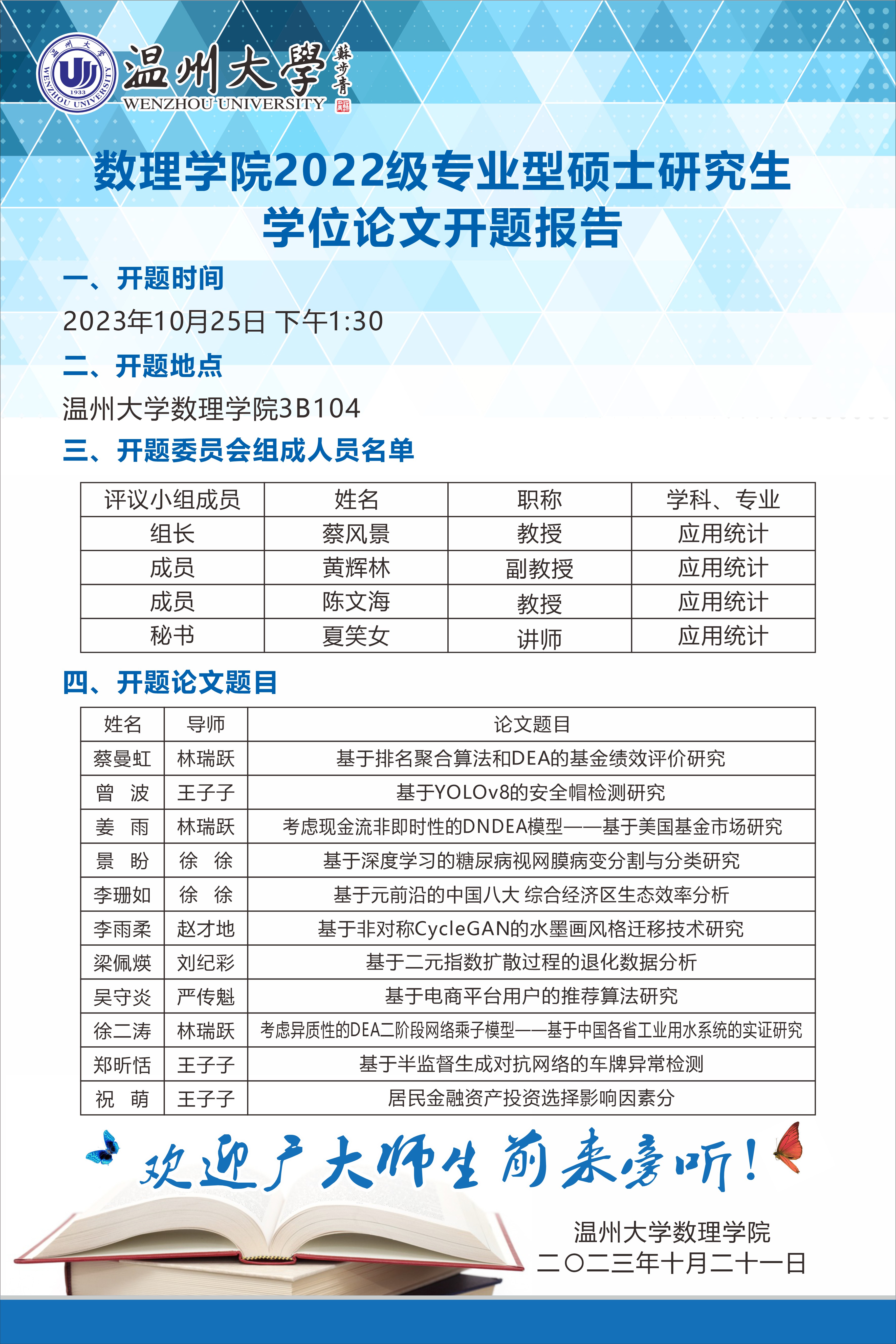 3044永利2022级应用统计专业型硕士研究生学位论文开题报告信息公告