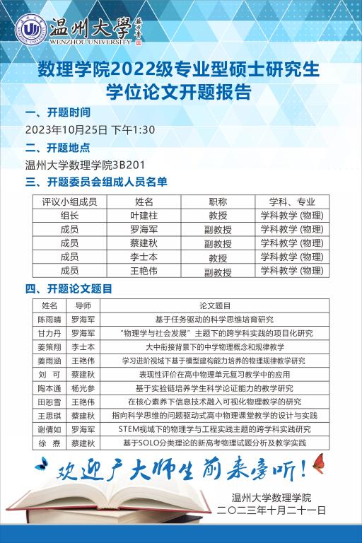 3044永利2022级学科教学(物理)专业型硕士研究生学位论文开题报告信息公告