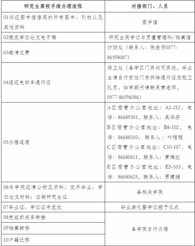 1.关于离校手续办理。请研究生毕业生登录“研究生离校系统”(6月1日开放)在线办理离校,具体操作详见附件。确认研究生毕业生已通过图书馆、计财处、档案馆、保卫处、宿管中心的审核后再发放毕业证书和学位证书。