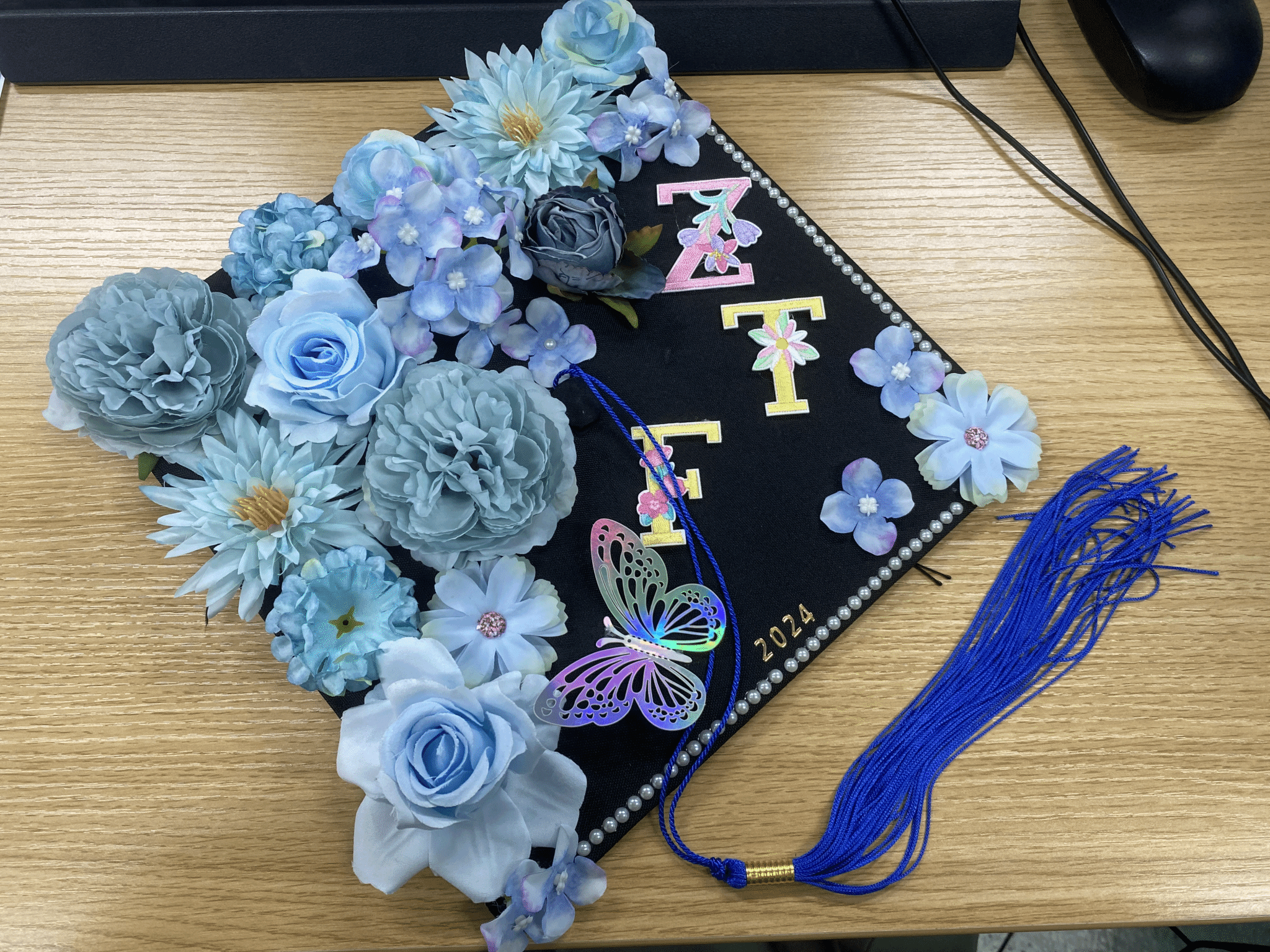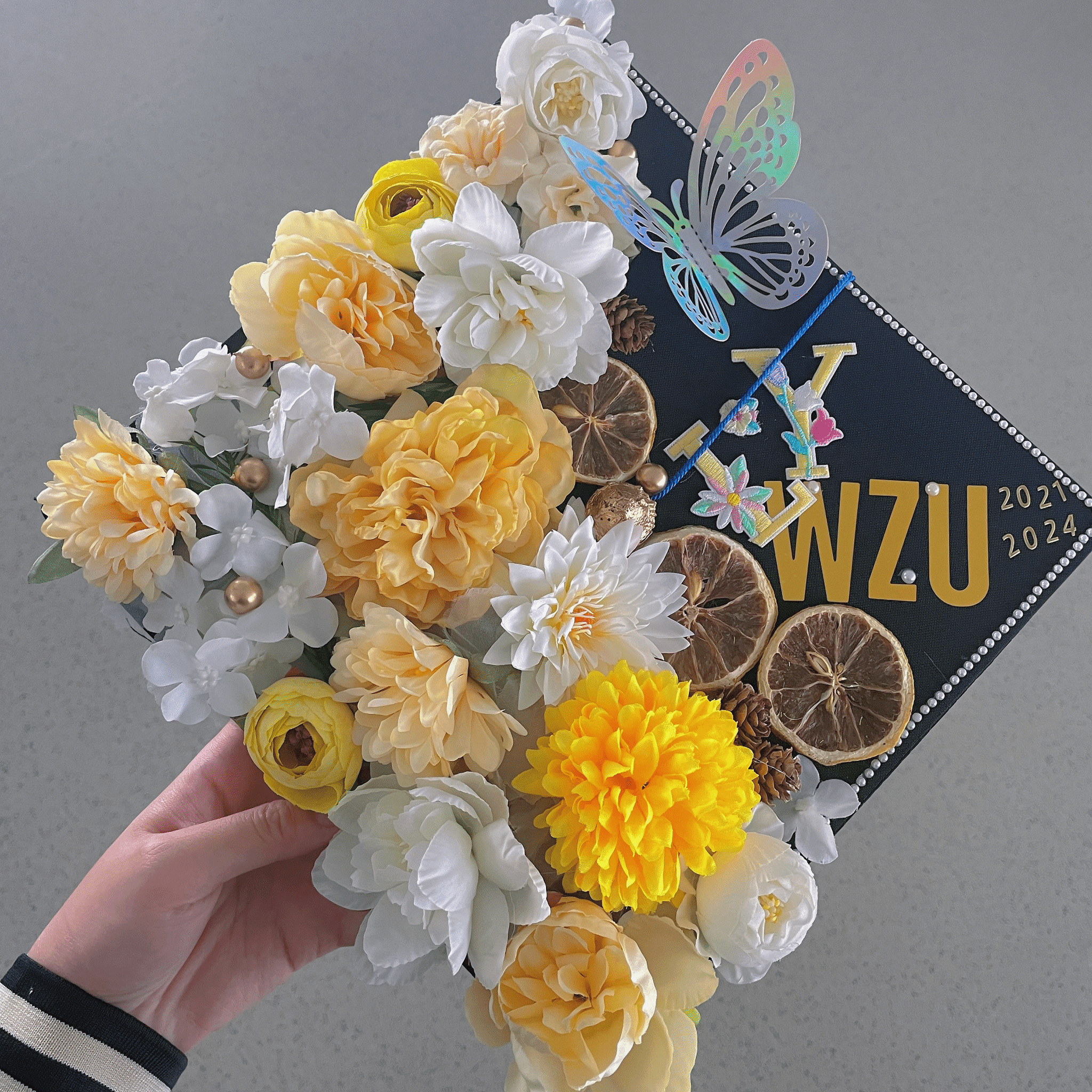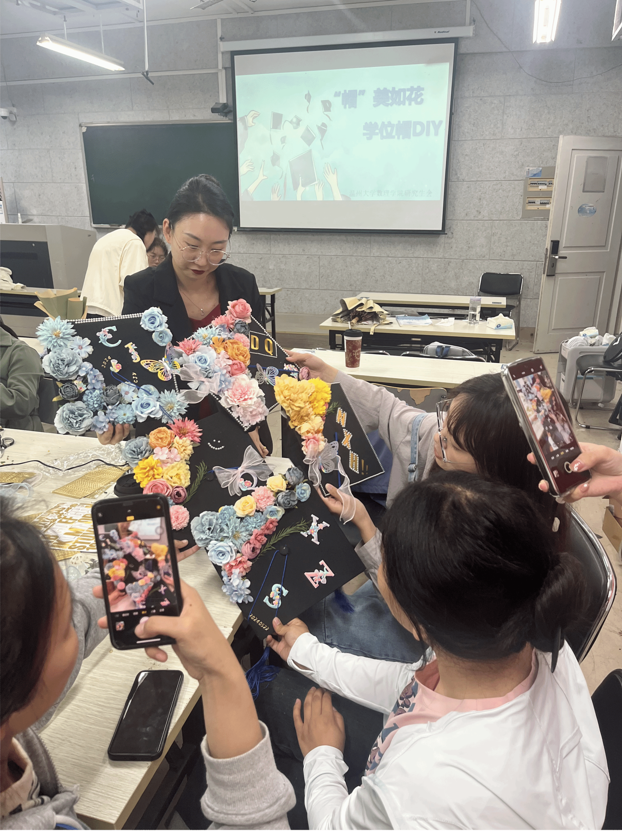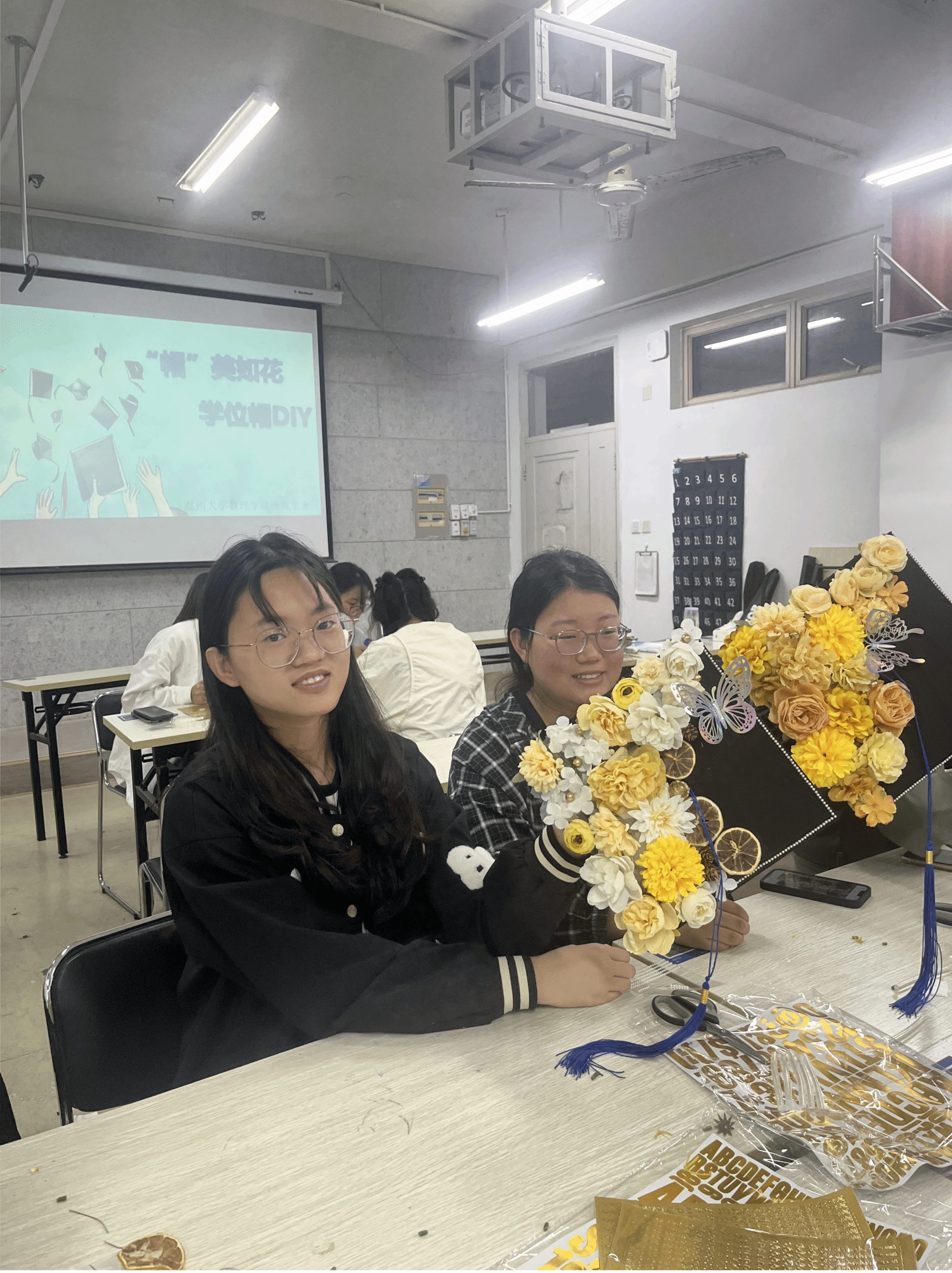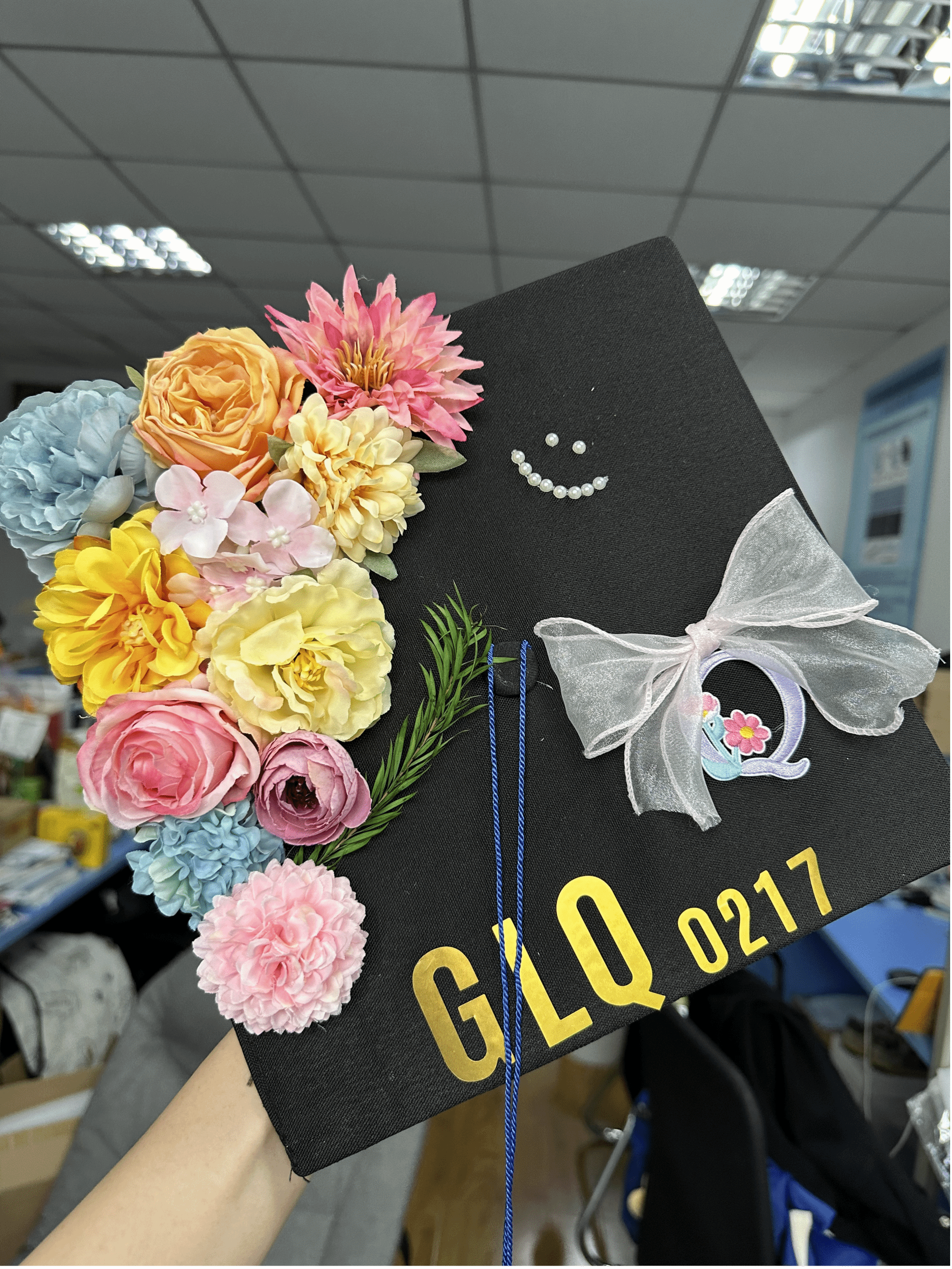 同学们手执热熔枪,以帽为“纸”,以花为“笔”,拼贴珍贵的回忆和美好的期待,描绘青春的色彩和绚丽的蓝图。两个小时后,原本朴素的学士帽被点缀得五彩斑斓,一顶顶独一无二、“帽”美如花的学位帽展现在大家面前,有花团锦簇的ins风,有可爱俏皮的卡通风,还有走古风路线的手写古诗体,繁多的种类让人挑花眼。