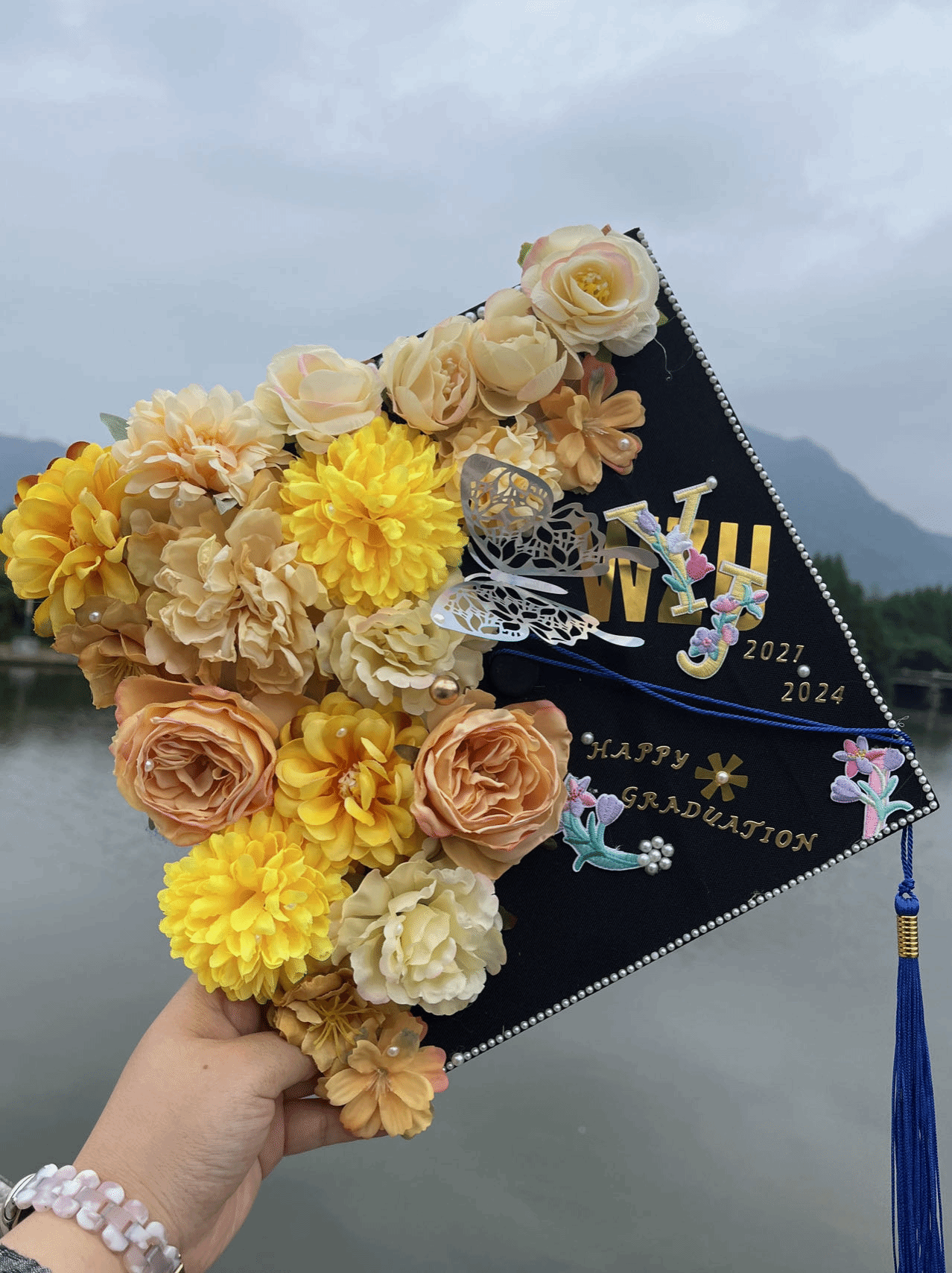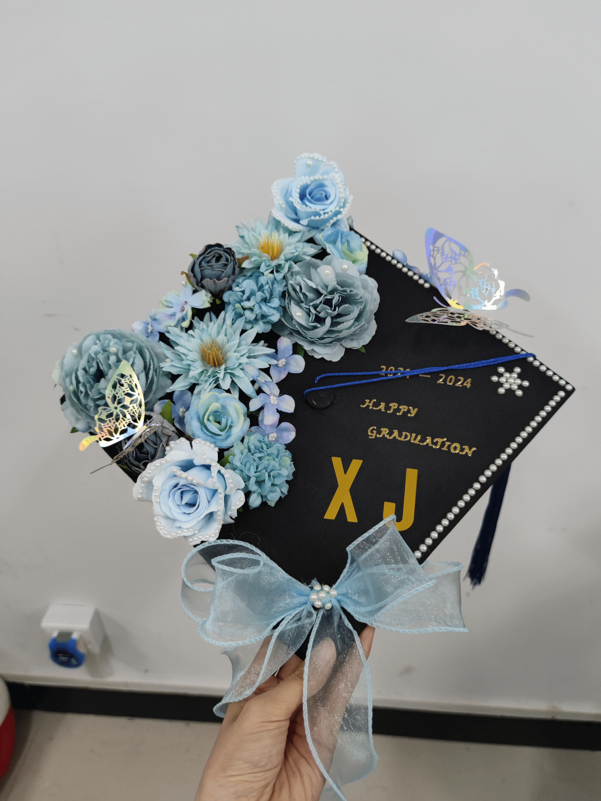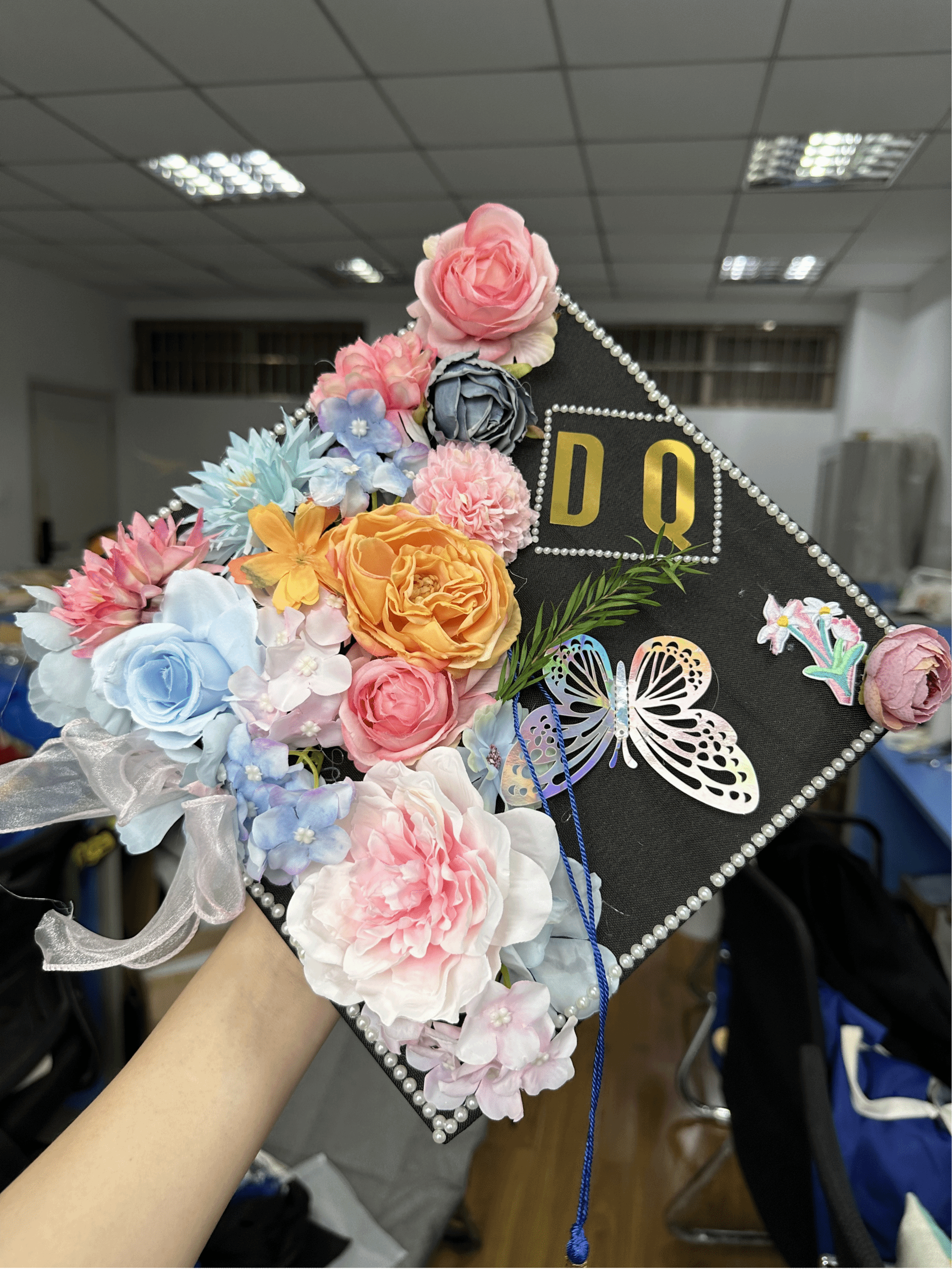 学士帽是西方学士毕业的一种仪式感着装,它原本的帽型设计比较严肃。四四方方的形状给人一种规则性很强的观感,但同时它也会显得有些呆板。纯黑的帽底看起来比较传统,虽然百搭但是拍摄毕业照时候会区分不出个人特点。在同学们的改造下,让原本呆板的帽子一下子就变得可爱生动起来。
