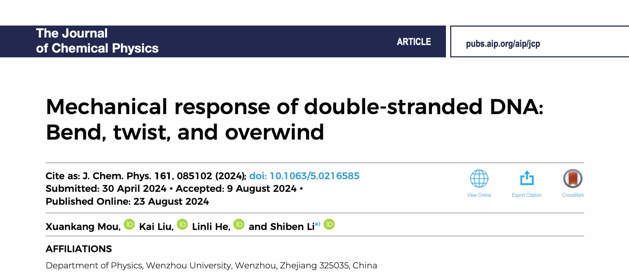 [1] X. Mou, K. Liu, L. He, and S. Li *, “Mechanical response of double-stranded DNA: Bend, twist, and overwind,” J. Chem. Phys. 161, 085102 (2024). https://doi.org/10.1063/5.0216585
