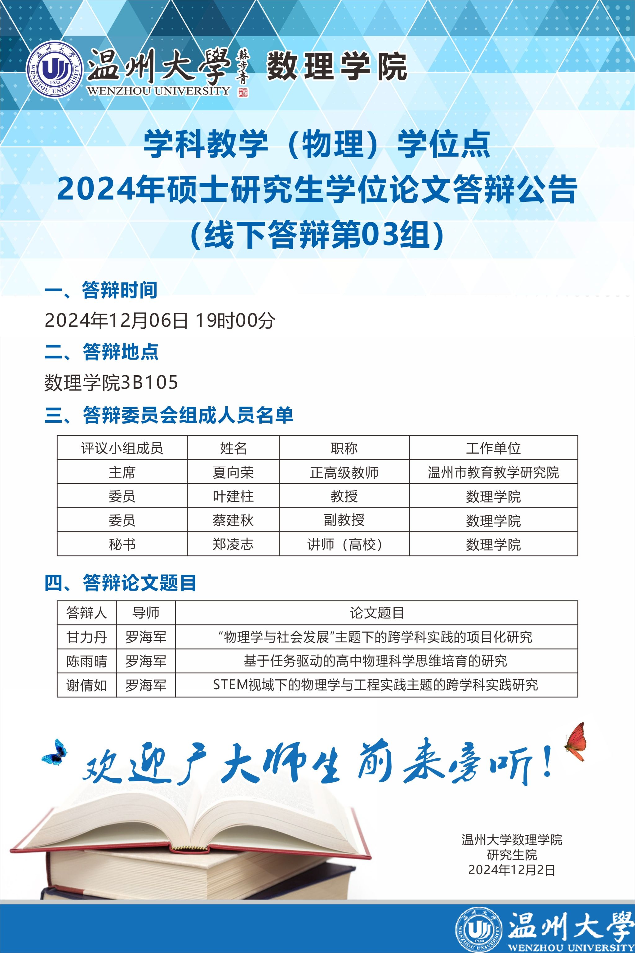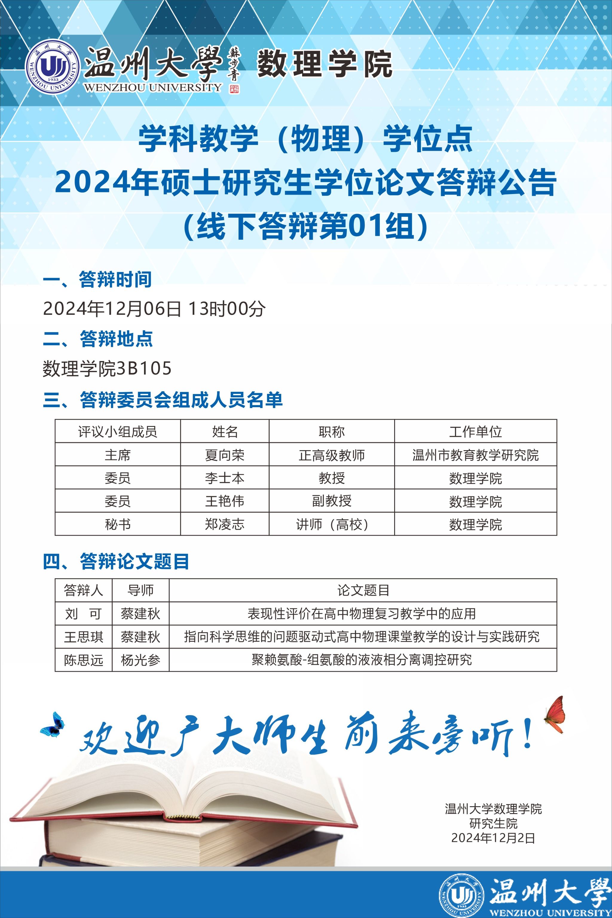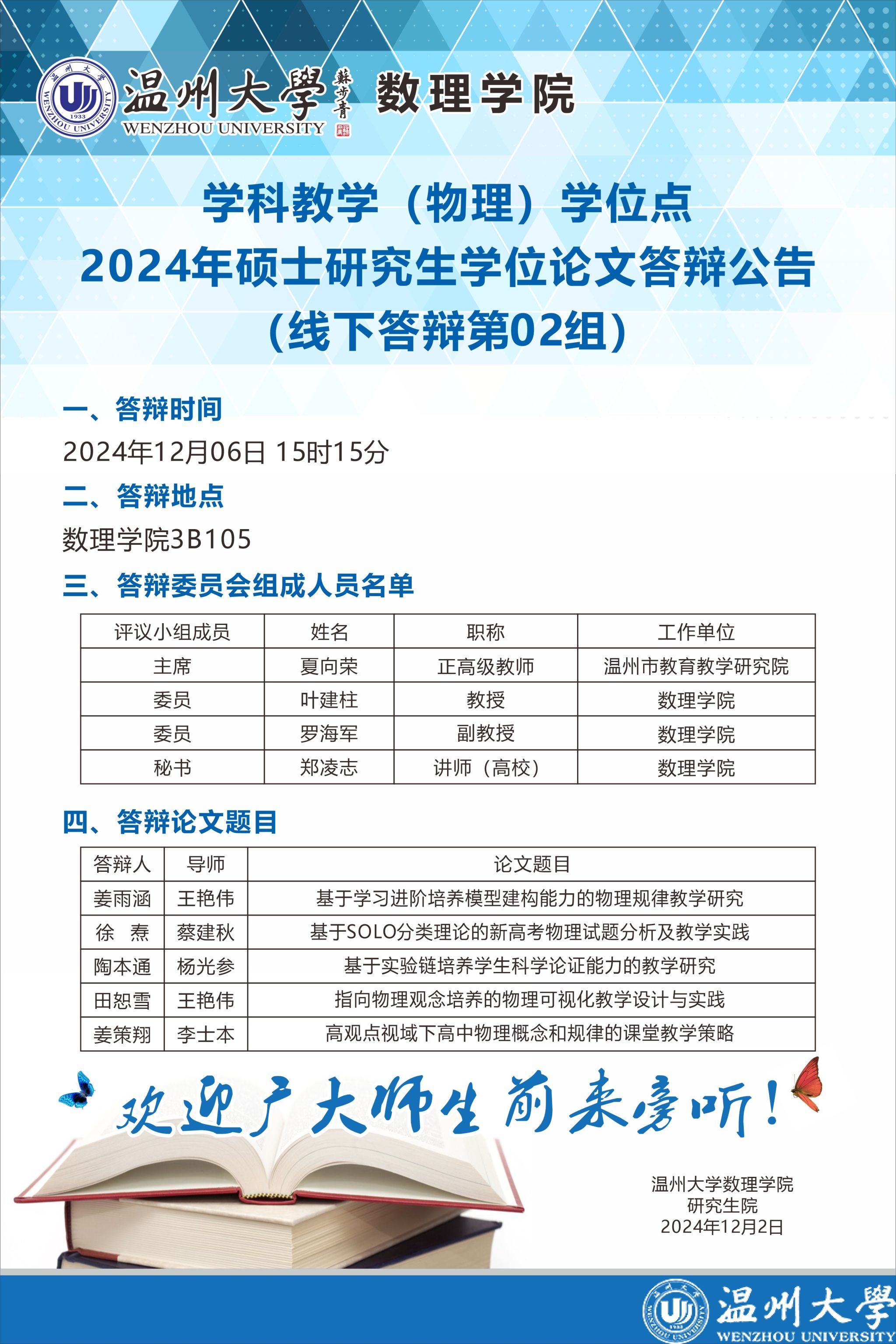 学科教学(物理)学位点2024年硕士研究生学位论文答辩公告