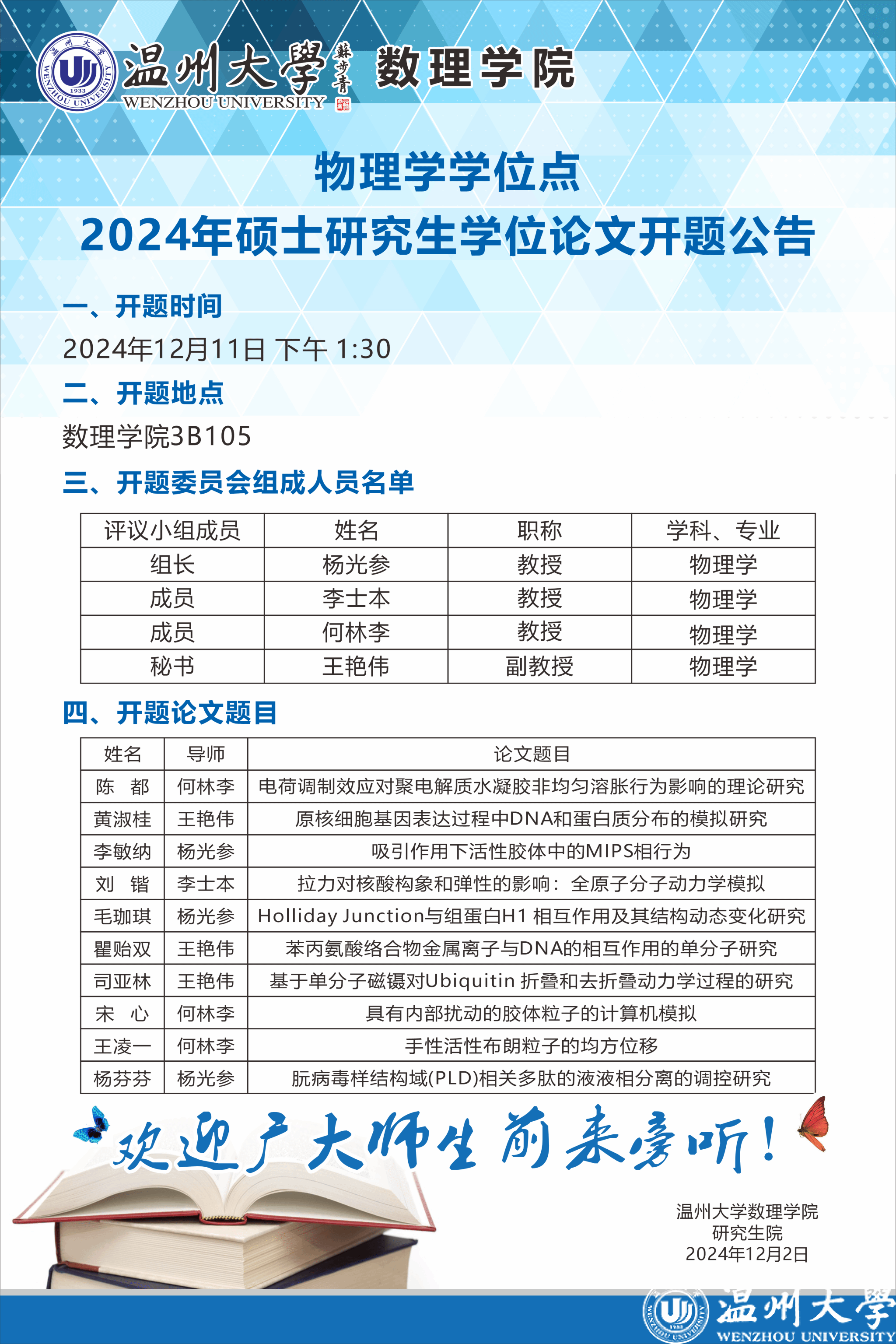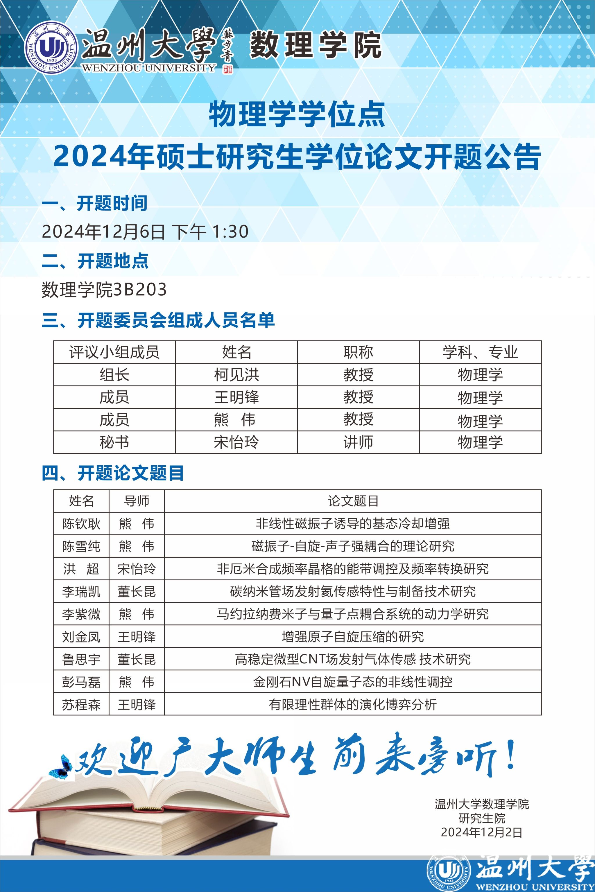 3044永利2023级(物理学)学术型硕士研究生学位论文开题报告信息公告