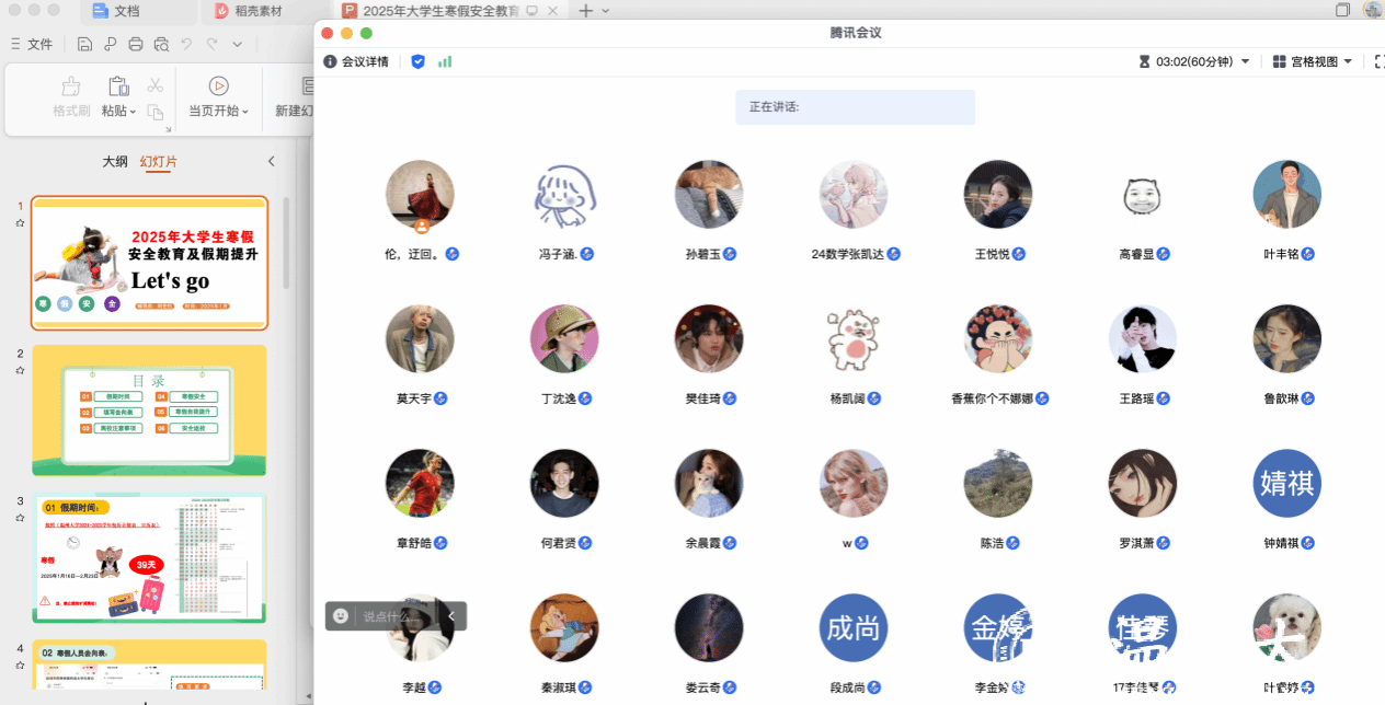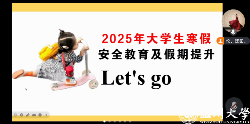 随着寒假的临近,为了增强员工的安全意识,确保每位同学都能度过一个愉快、安全的假期,2025年1月5日,3044永利刘伦伦老师在腾讯会议召开了2025年寒假安全教育及假期提升线上会议,本次会议主要强调了假期时间、离校流程、离校注意事项、寝室安全、交通安全、水电安全、意识形态和马克思主义宗教观等几个方面。