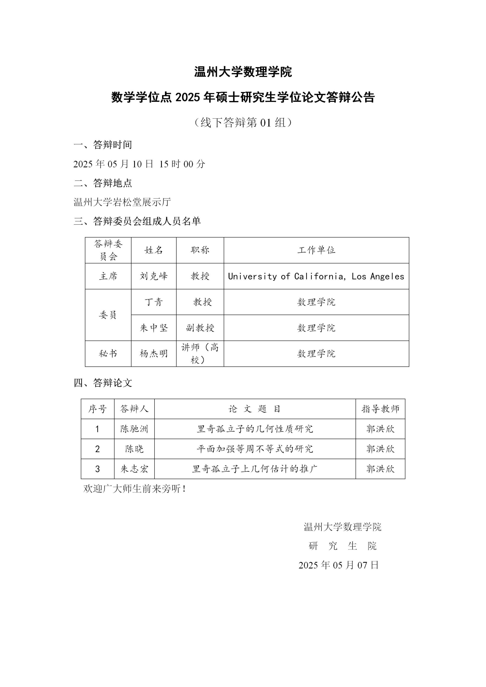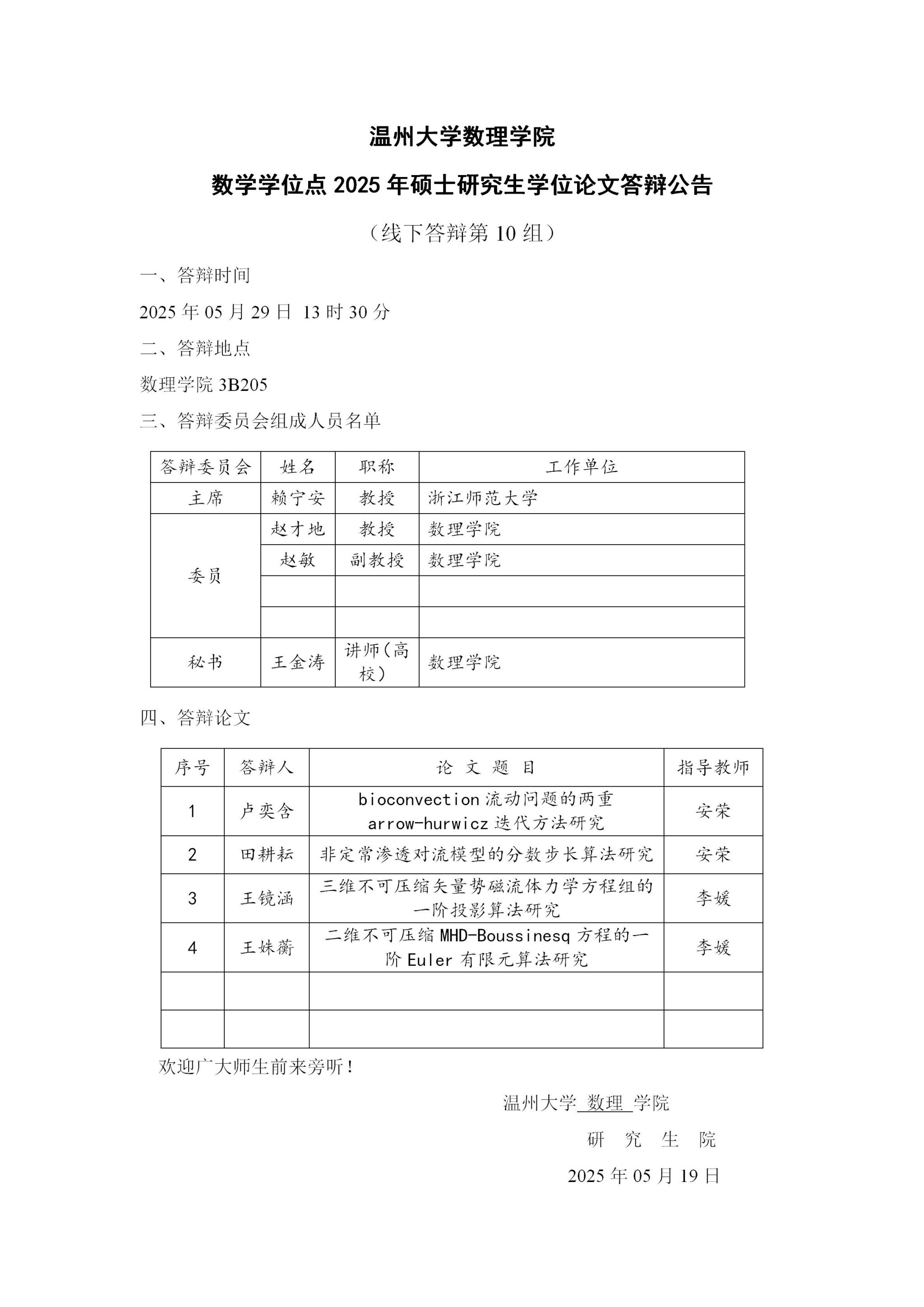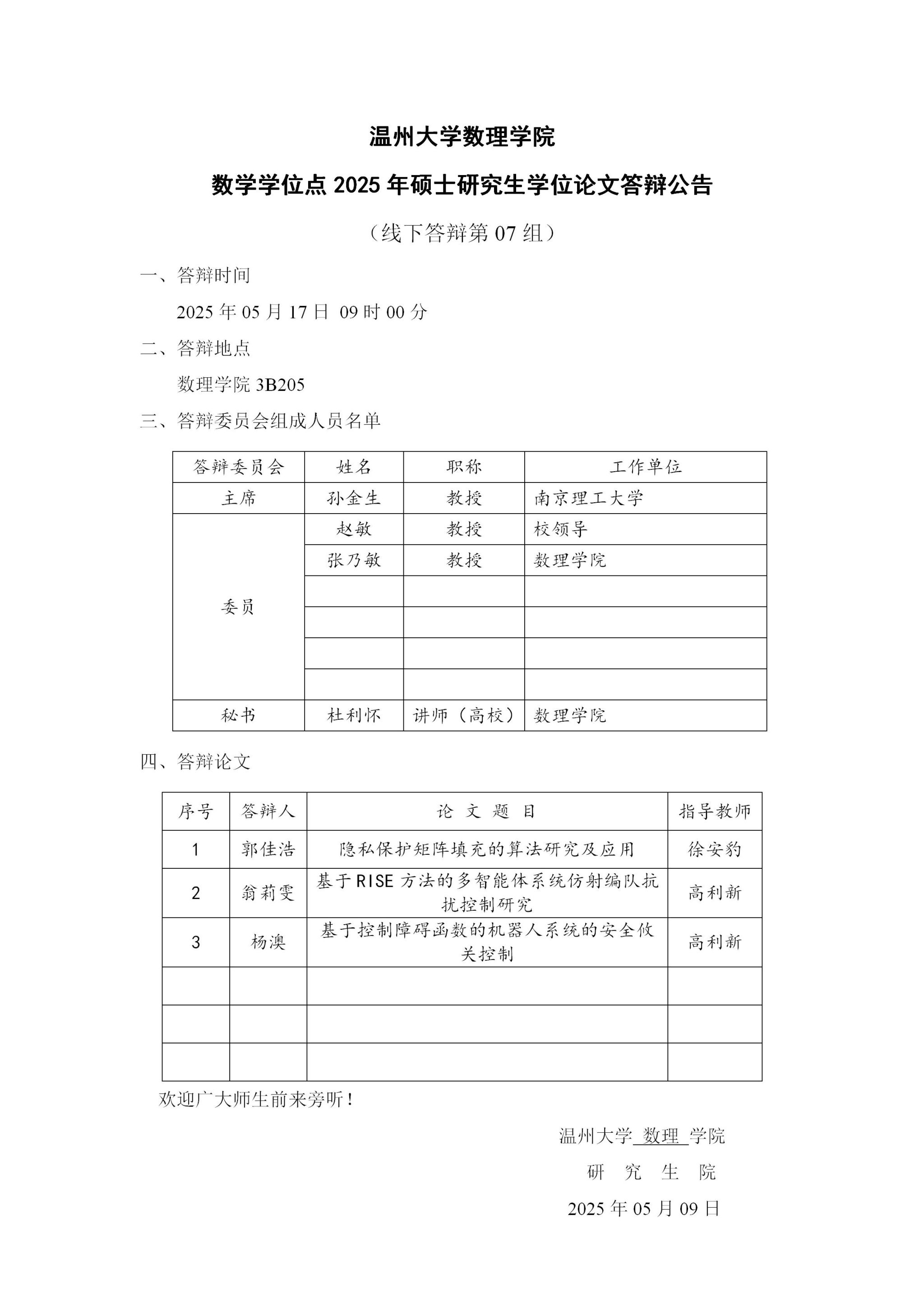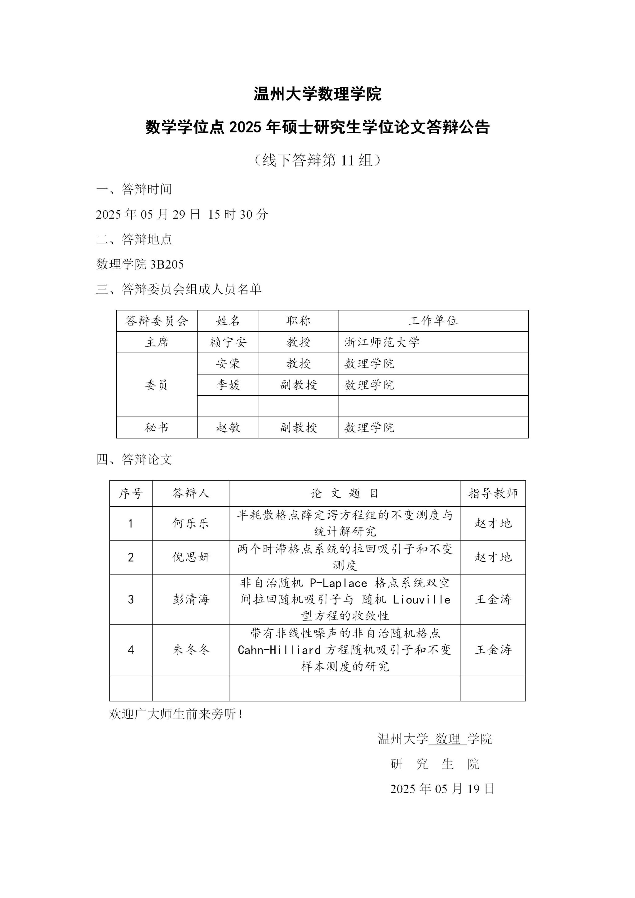 3044永利数学学位点2025年硕士研究生学位论文答辩公告