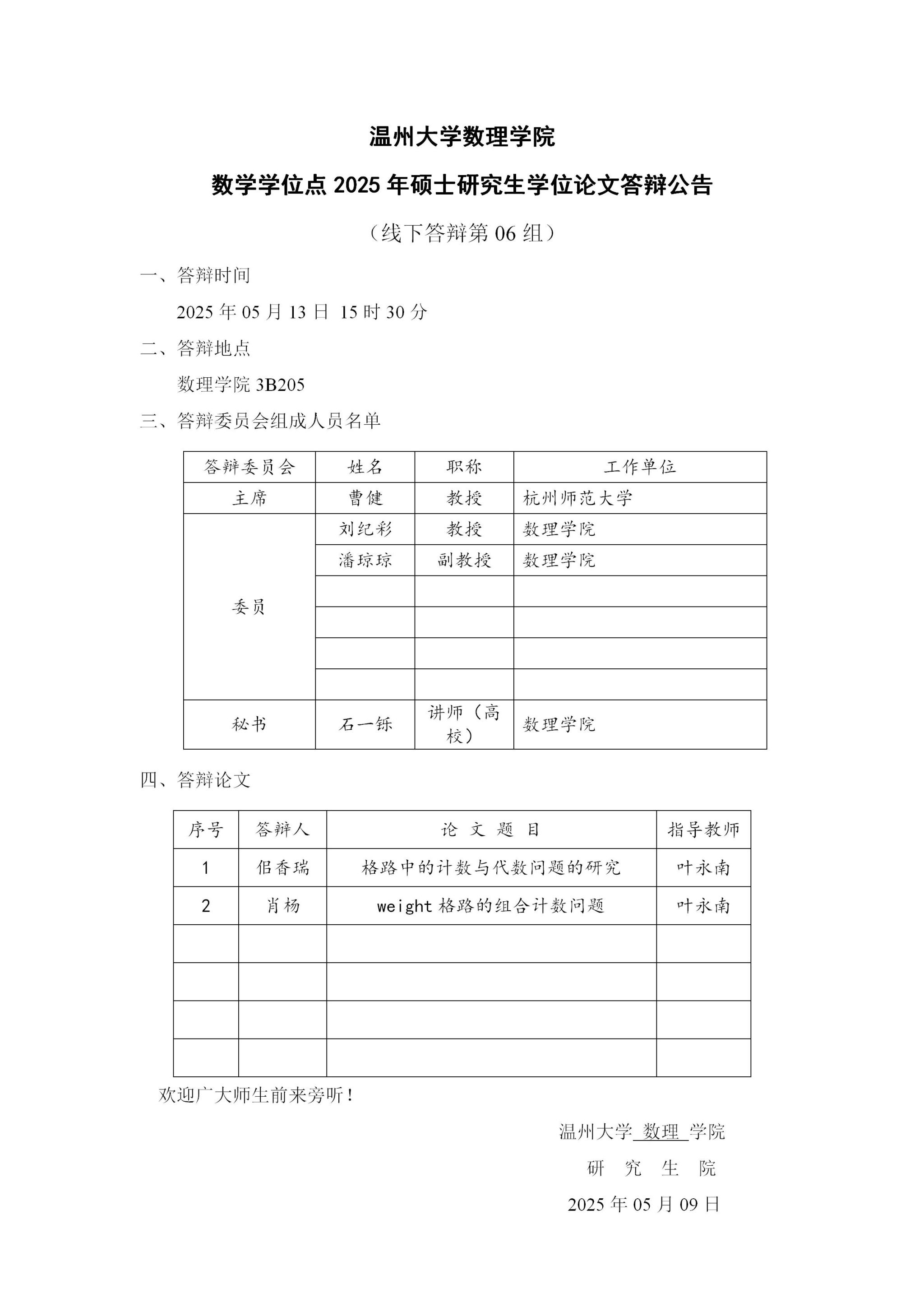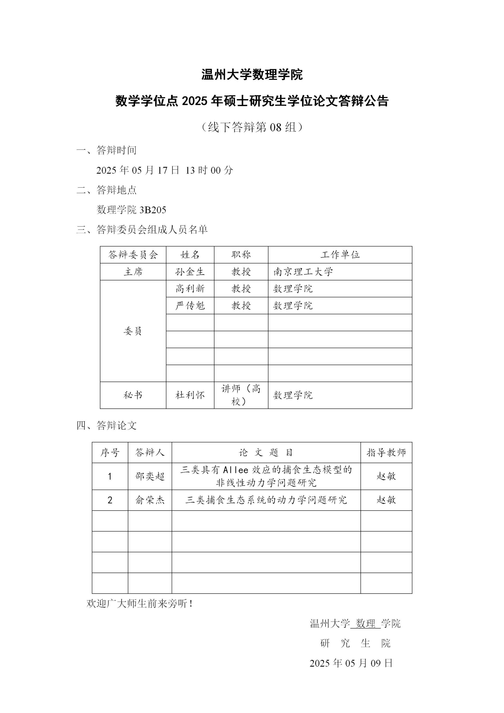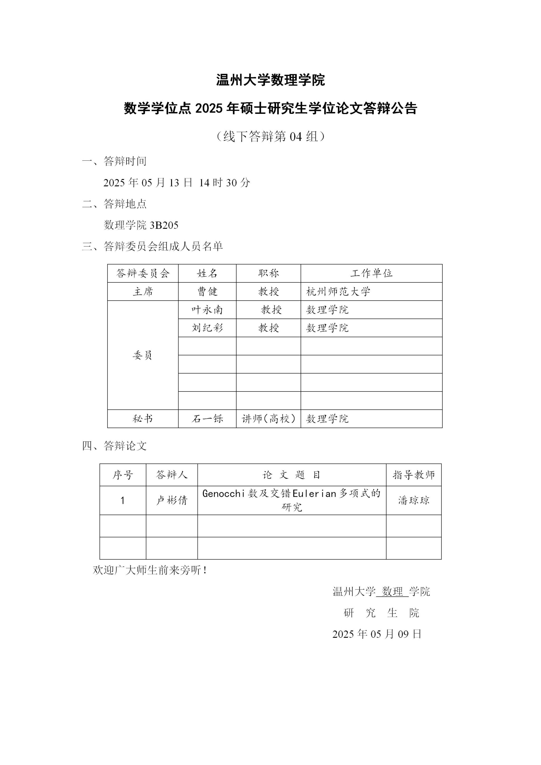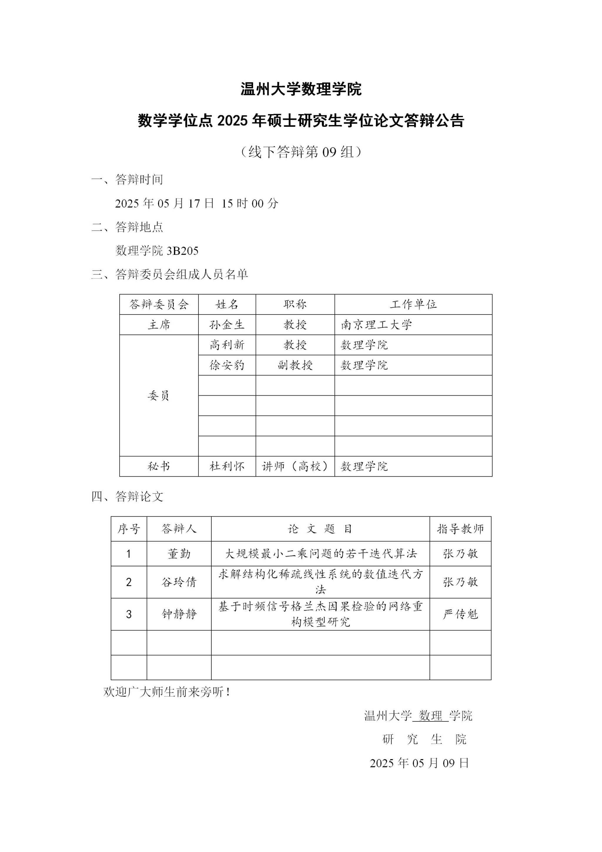 3044永利数学学位点2025年硕士研究生学位论文答辩公告