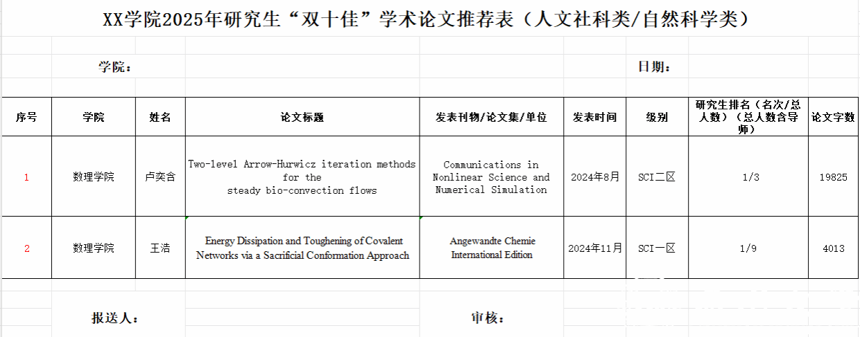 根据《关于开展2025年3044永利集团研究生学术论文“双十佳” 评选的通知》,经研究生积极申报、公司组织专家评审,拟将《Two-level finite element methods for the steady bio-convection flows problem》等2篇学术论文推荐参评3044永利集团2025年研究生学术论文“双十佳”评选。现将评审结果予以公示,如有异议,请于公示期内与研工部联系。