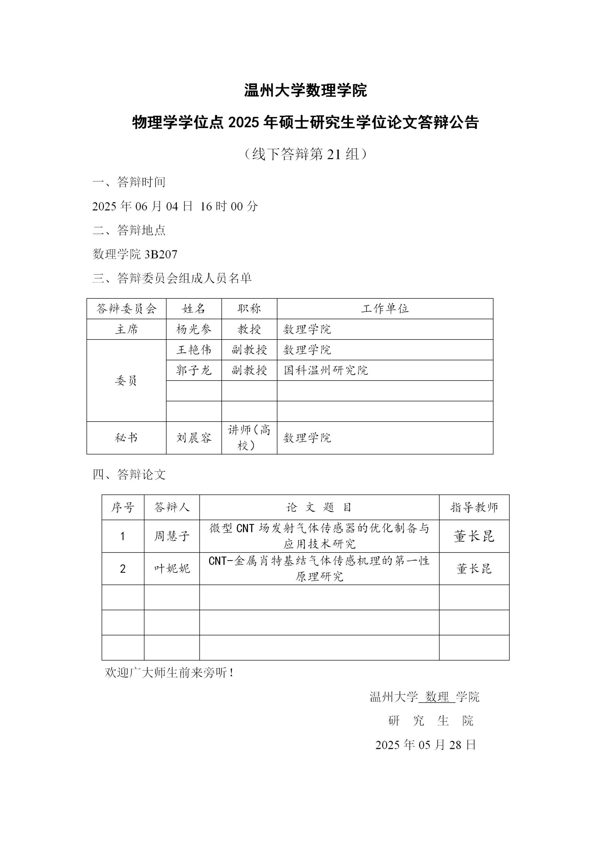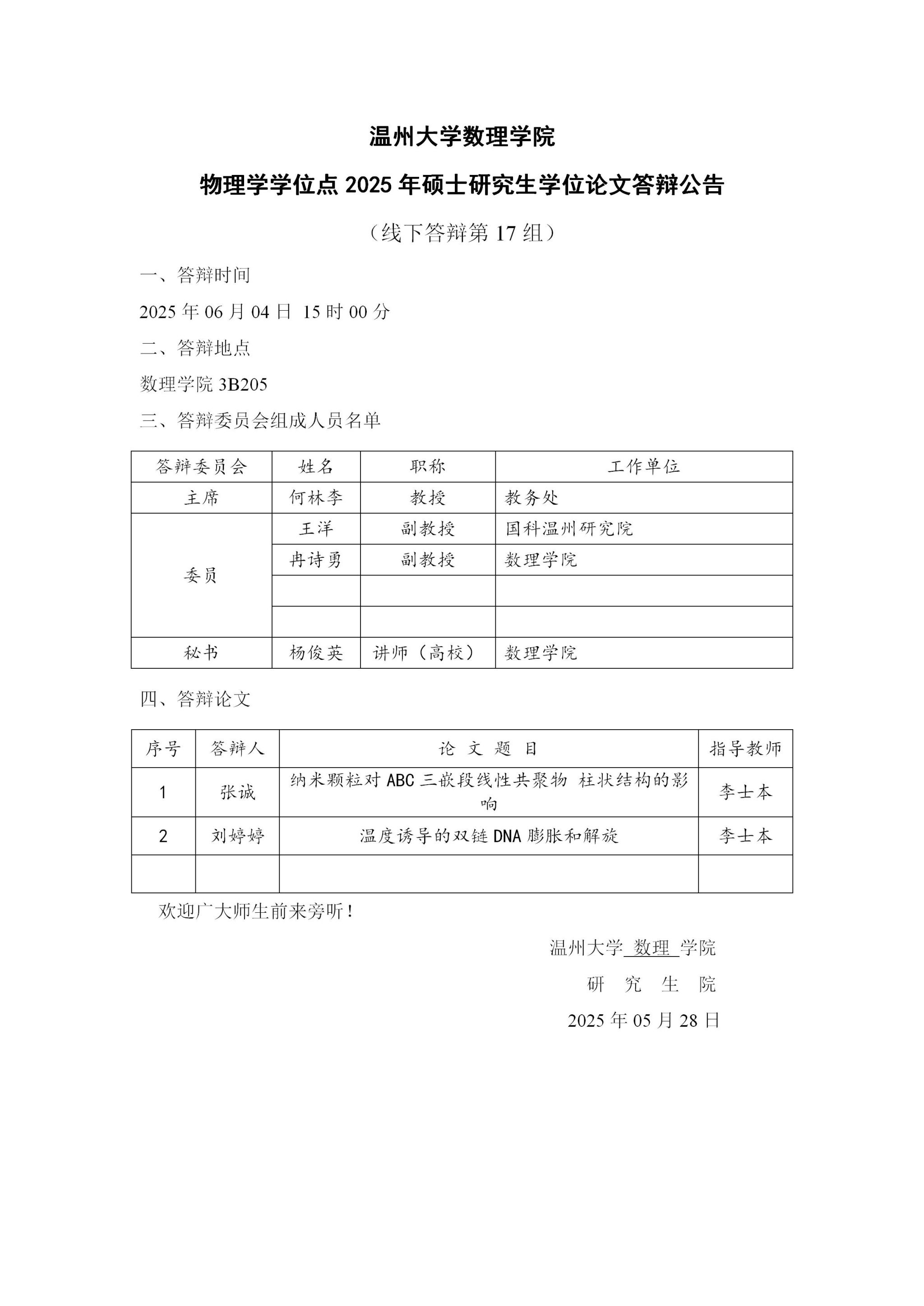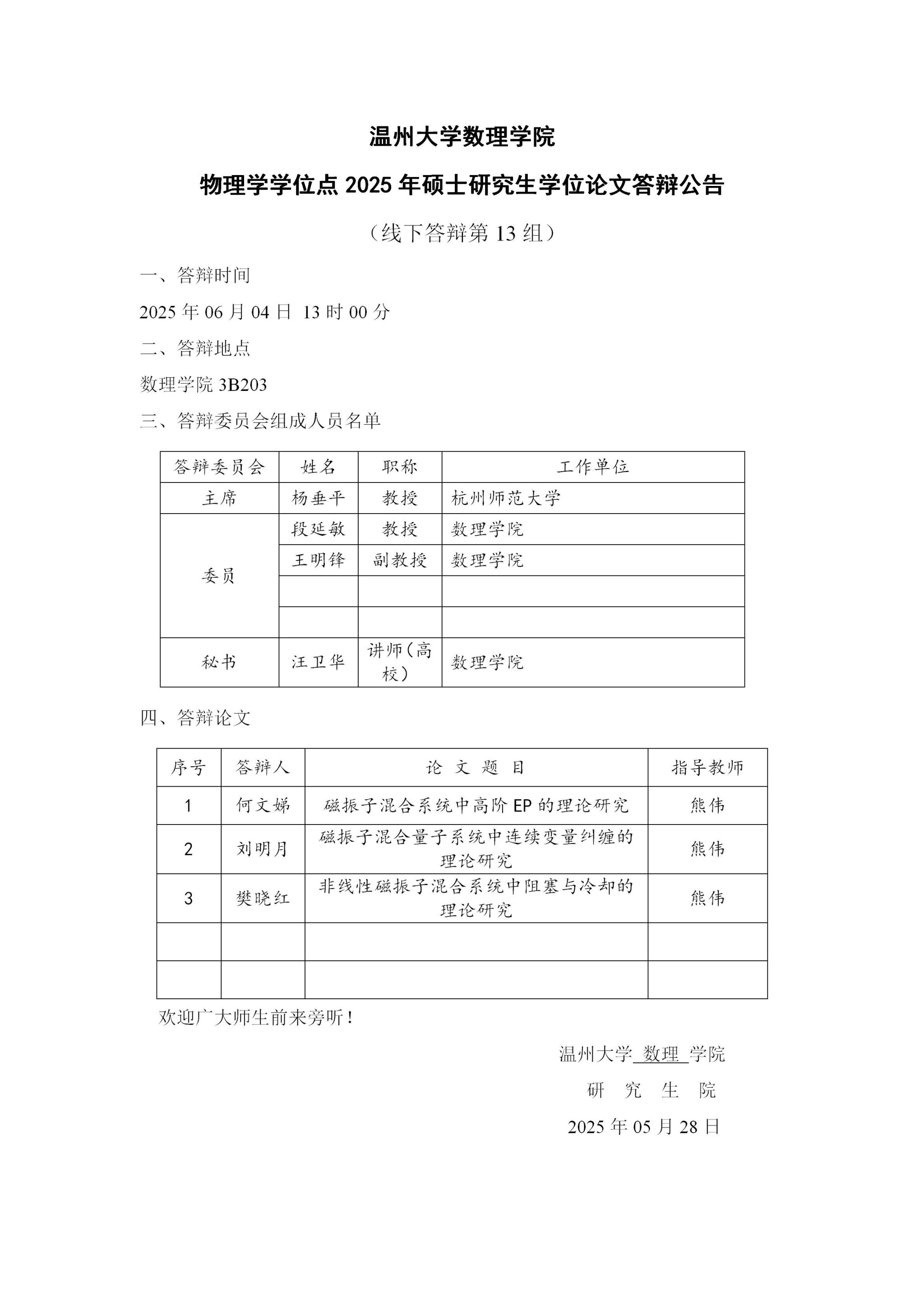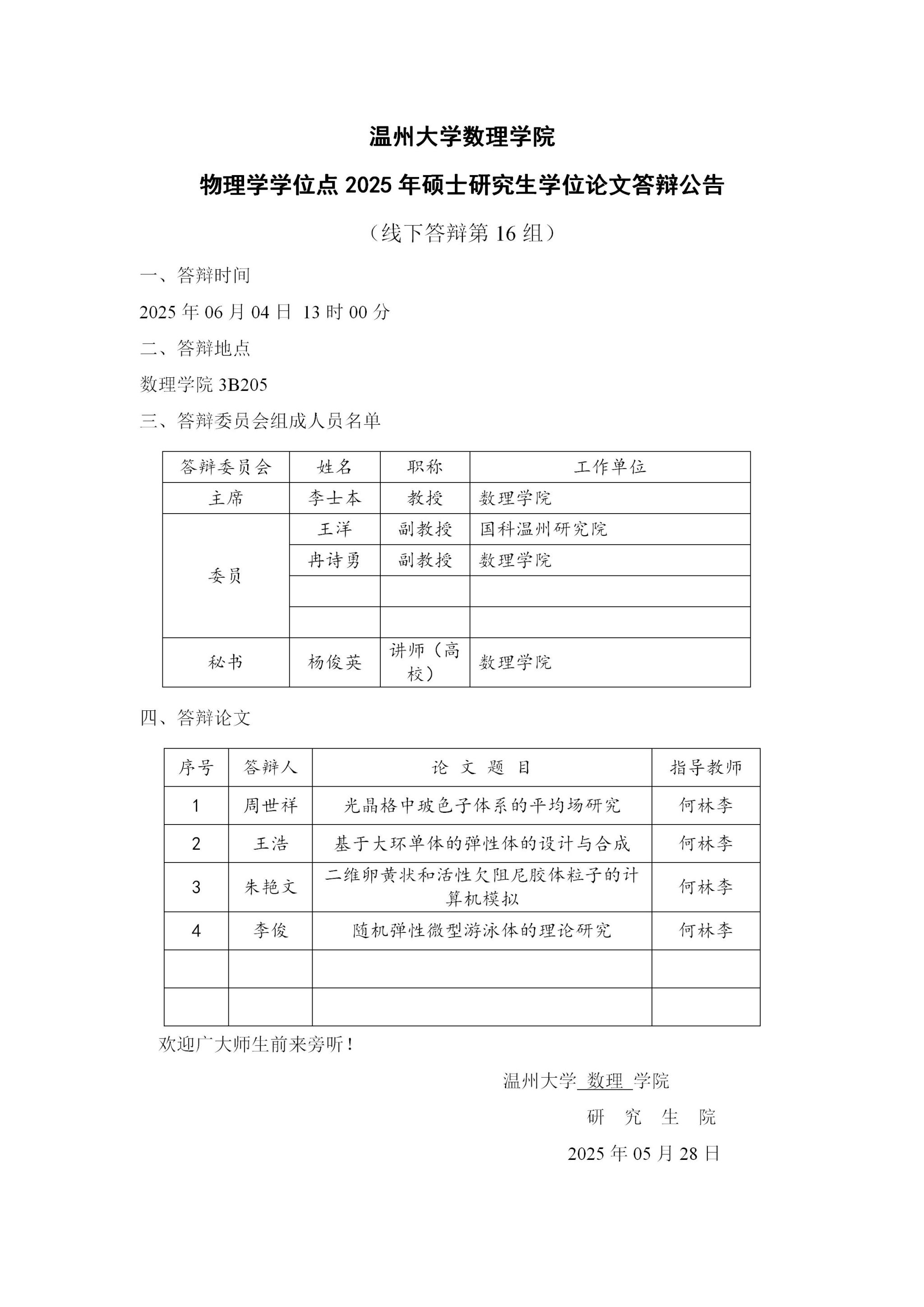 3044永利物理学学位点2025年硕士研究生学位论文答辩公告