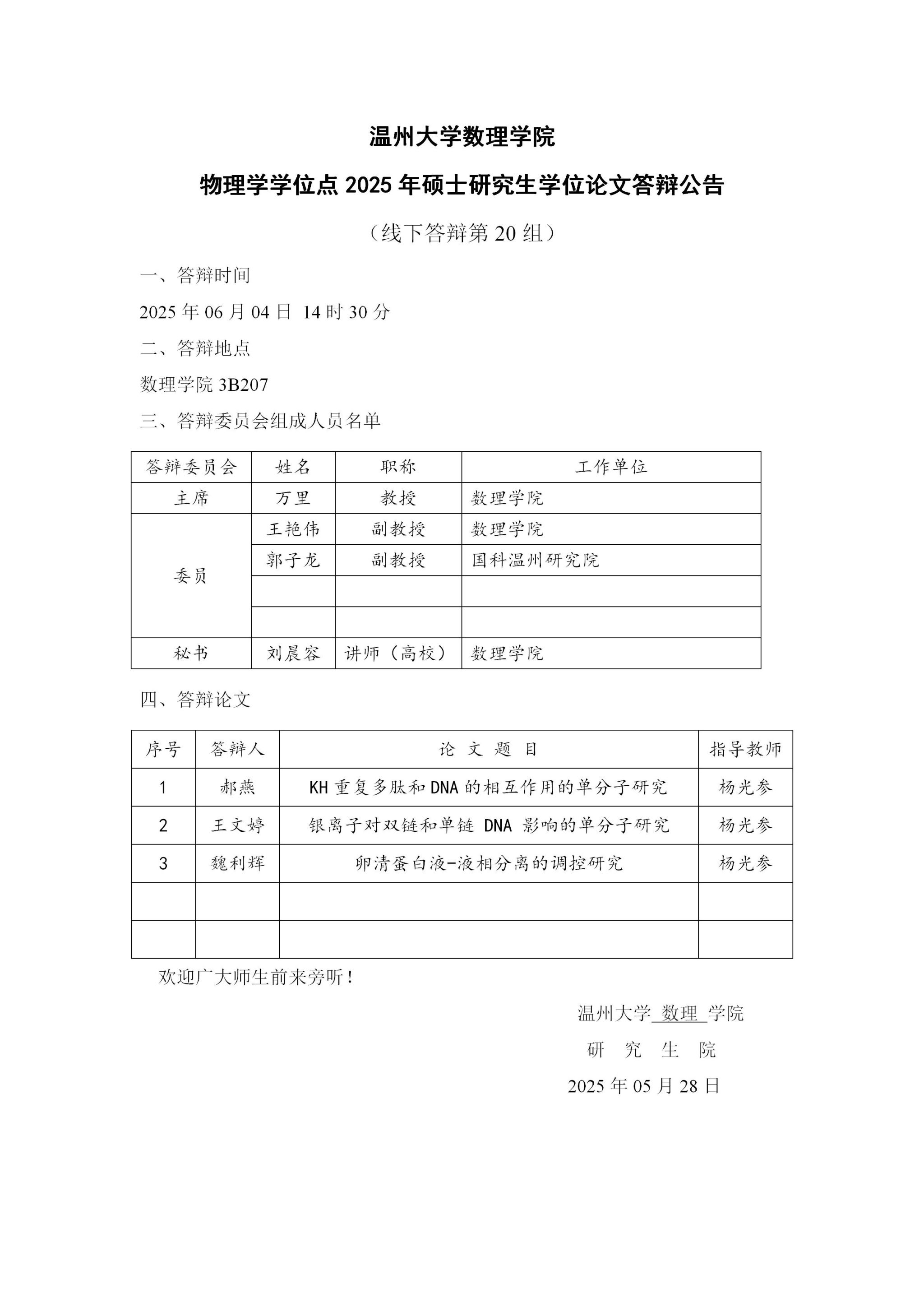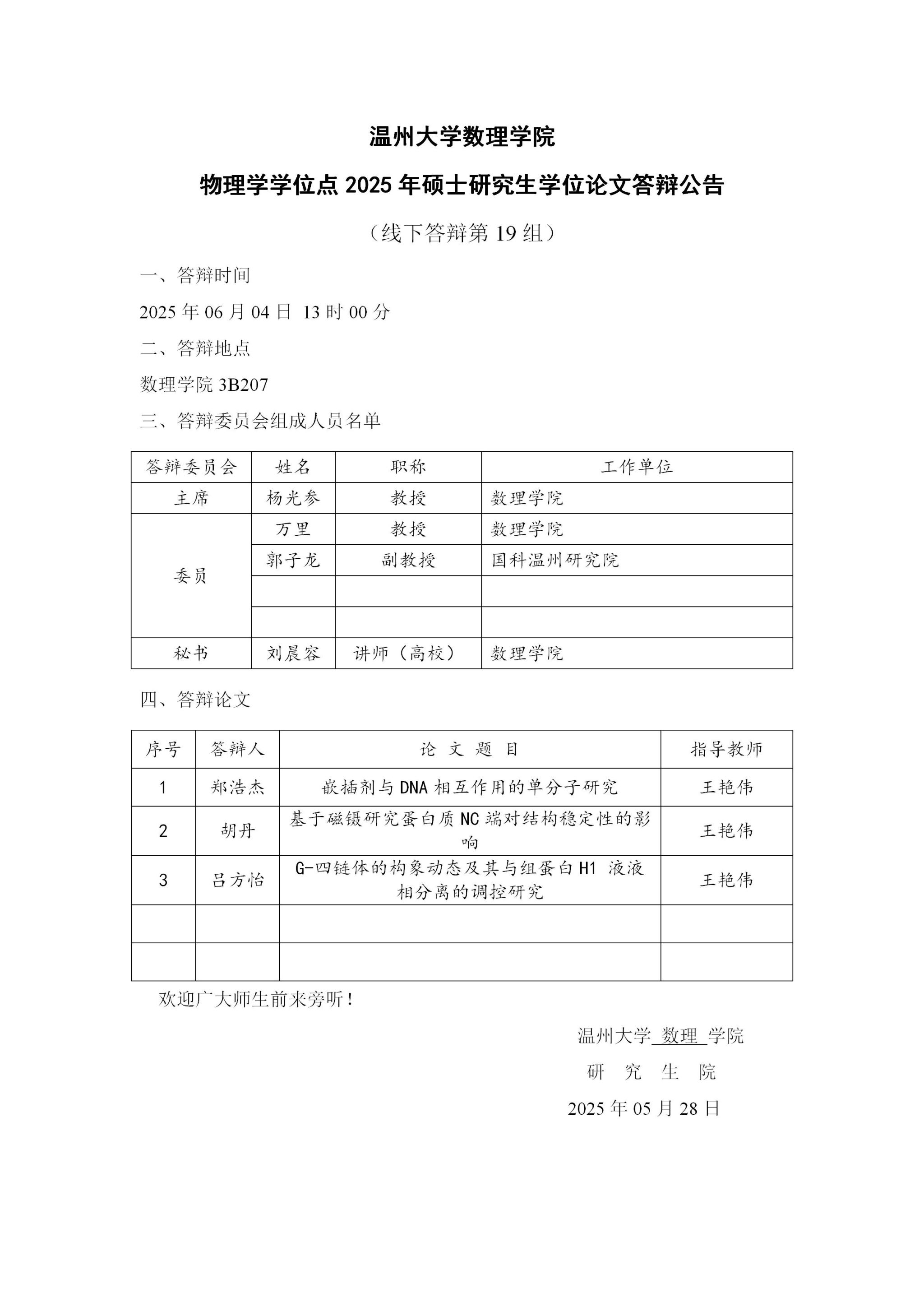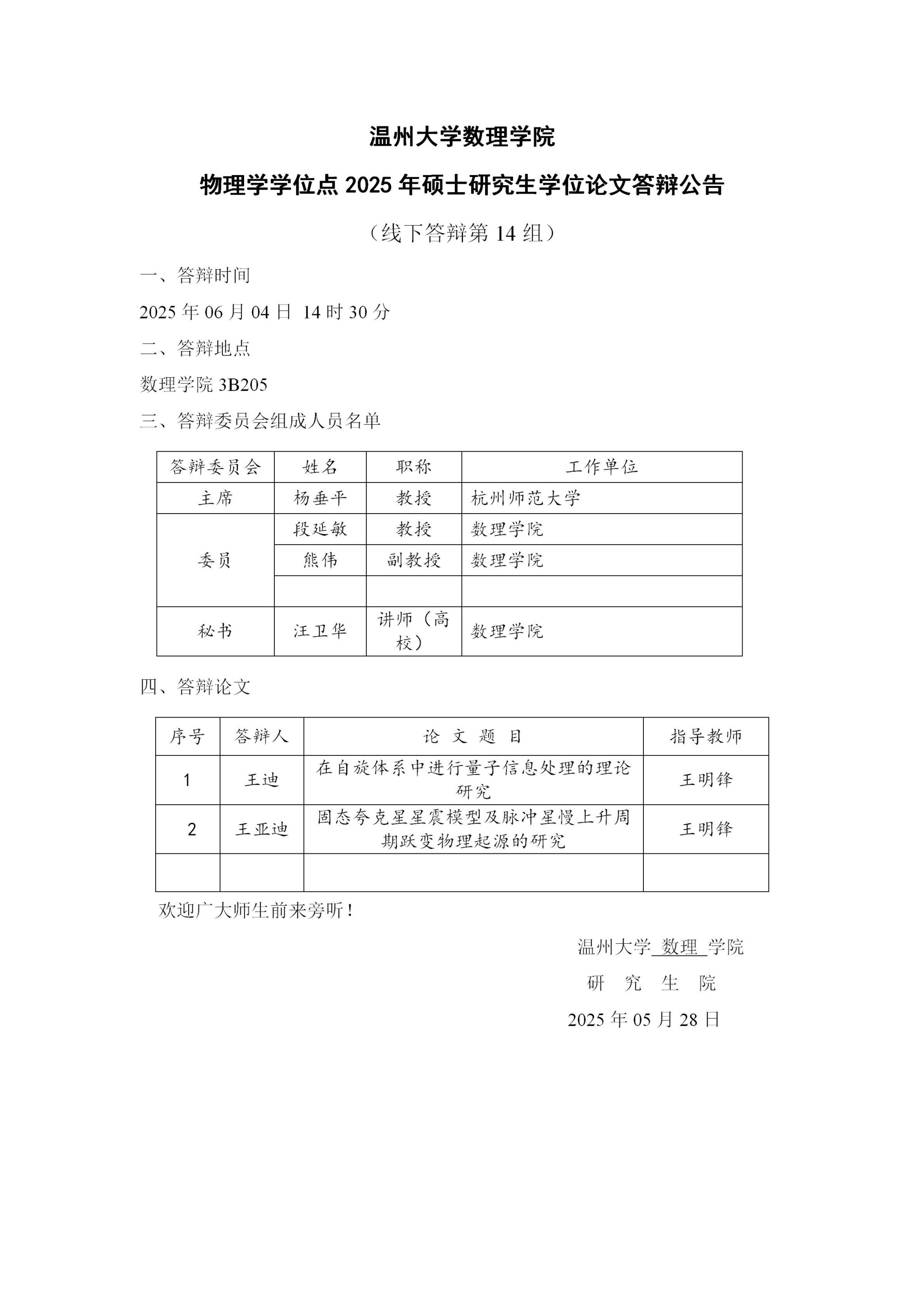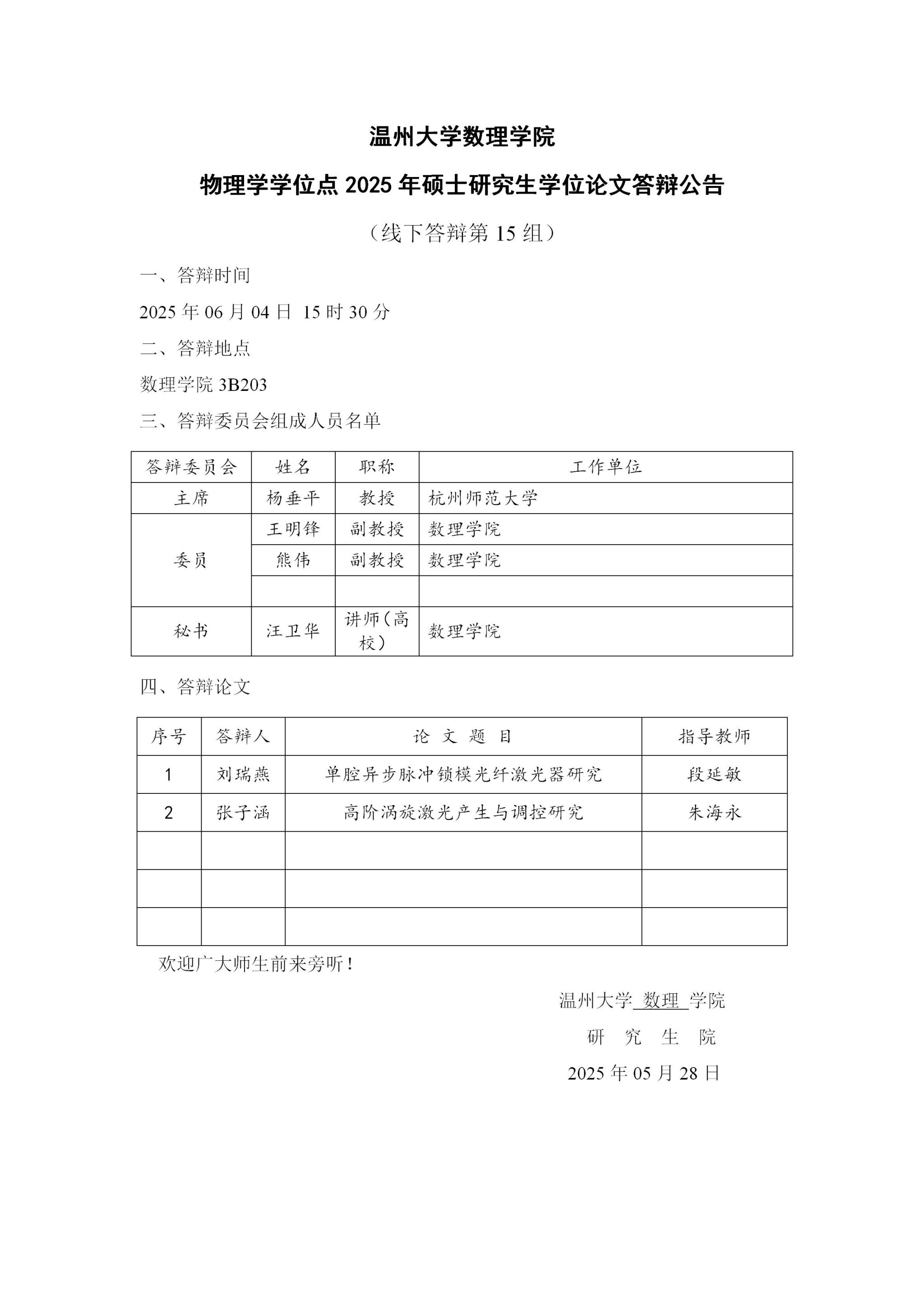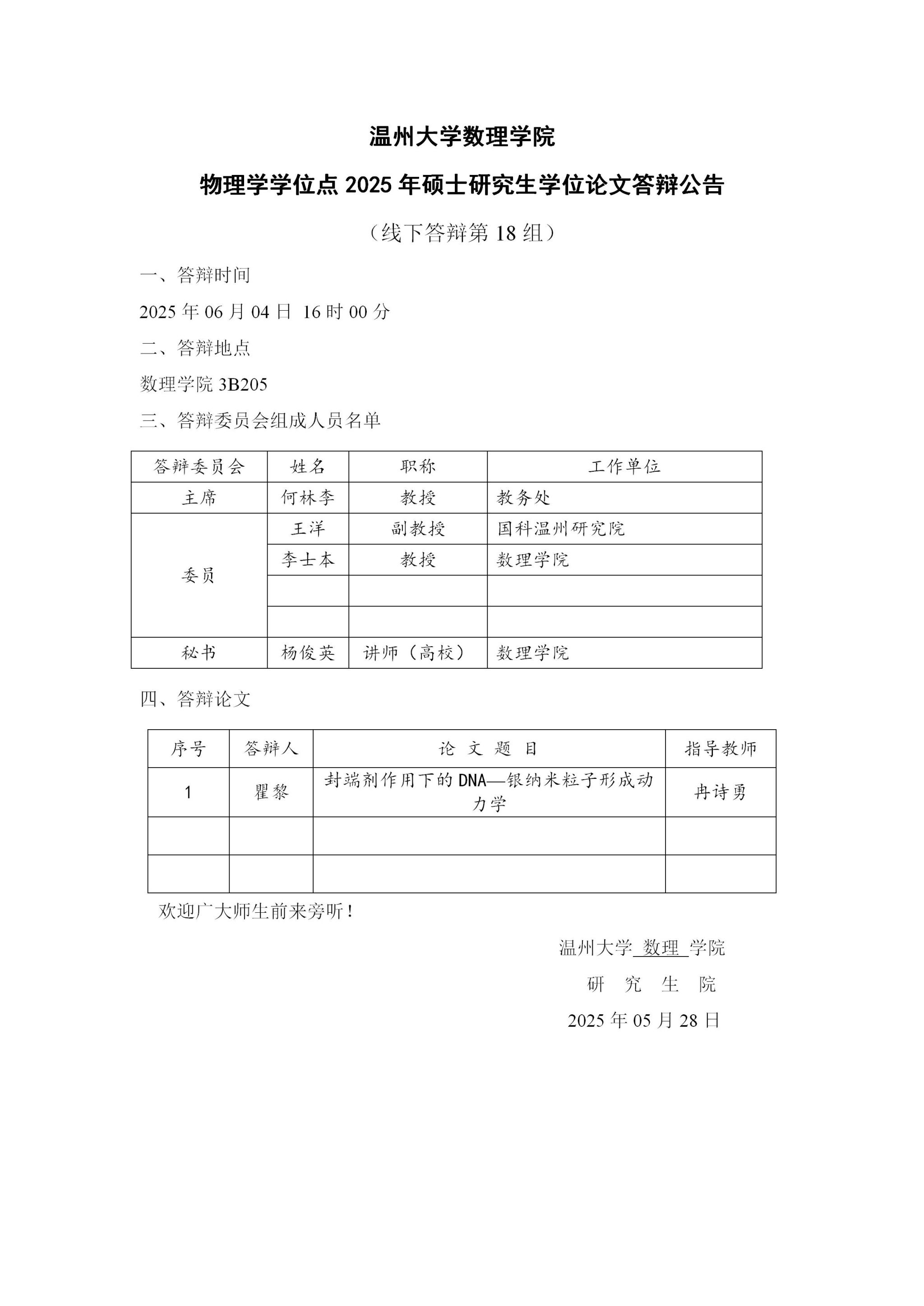 3044永利物理学学位点2025年硕士研究生学位论文答辩公告