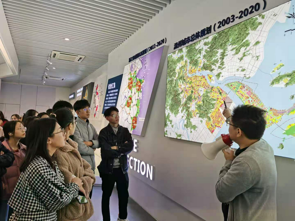 在瓯江口新区规划展示馆,研究生新生通过场馆讲解员的讲解、观看温州城市发展成果和规划远景、在3D立体影院体验三维数字城市等形式,深入了解温州悠久的历史文化和当前的城市化发展进程,感知未来东海时代温州巨大的发展潜力。