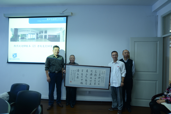 2013年10月31日上午,数学与信息科学公司迎来了一批特殊的客人,他们是温师院数学系59(2)班的老员工,是温州师范专科公司升格为温州师范公司后数学专业第一届本科生。来的员工共35位,来自全国各地,年级最小也有72岁,大的近80岁,今年是他们毕业50年,恰逢公司办学80周年校庆,所以特地选择在母校聚会。