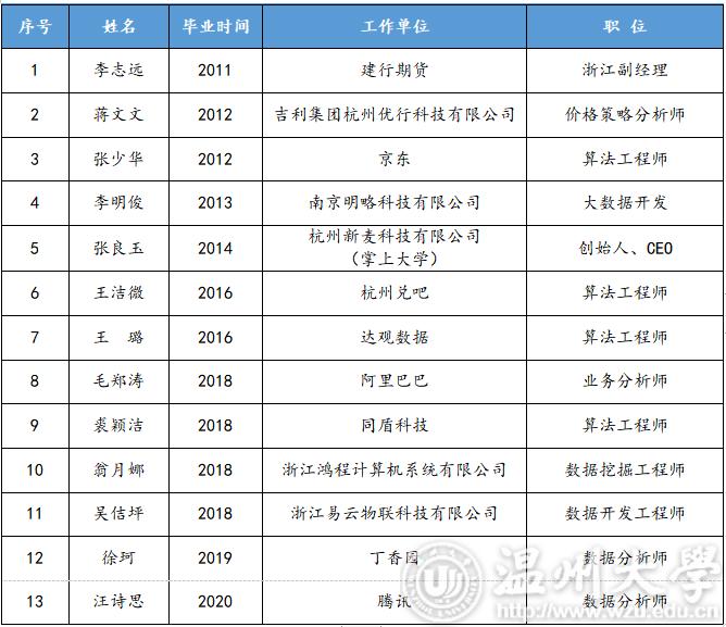 近4年来,有50多位同学考入英国谢菲尔德大学、香港理工大学、南京师范大学、北京师范大学、北京交通大学、上海财经政法大学等国内外知名高校研究生。近三年来,本专业就业率均达到95%以上,就业单位包括腾讯、阿里巴巴集团等高科技互联网类公司、银行和证券公司等金融企业、平安产险、中国人寿等保险企业、统计局和国税局等事业单位, 部分同学已成为卓越的数据分析师或行业骨干。