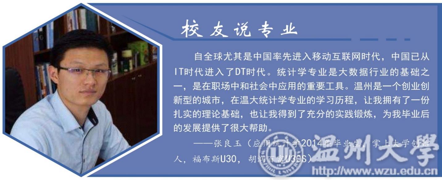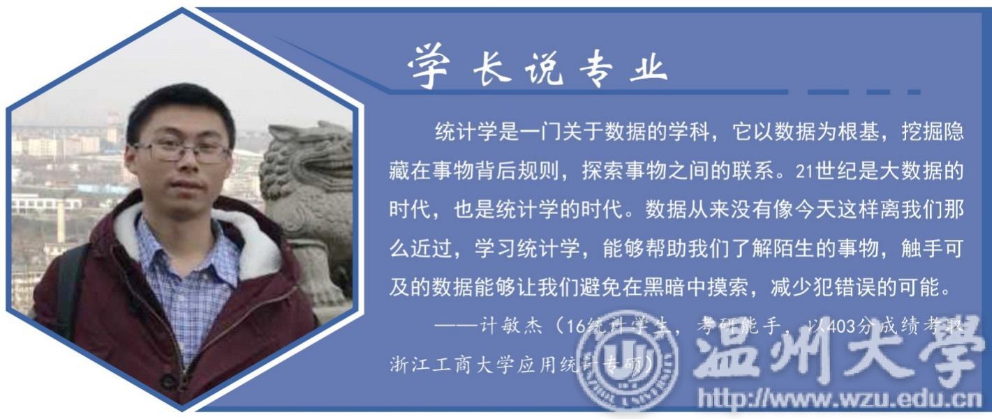 温大应用统计学专业已开设19年,这里有专业的教师团队为大家的专业学习保驾护航,还有贴心的辅导员团队和“幸福工作坊”为大家的课外生活添姿加彩,更有知心的学姐学长们带领大家逐步进入统计新世界。欢迎加入统计专业大家庭!