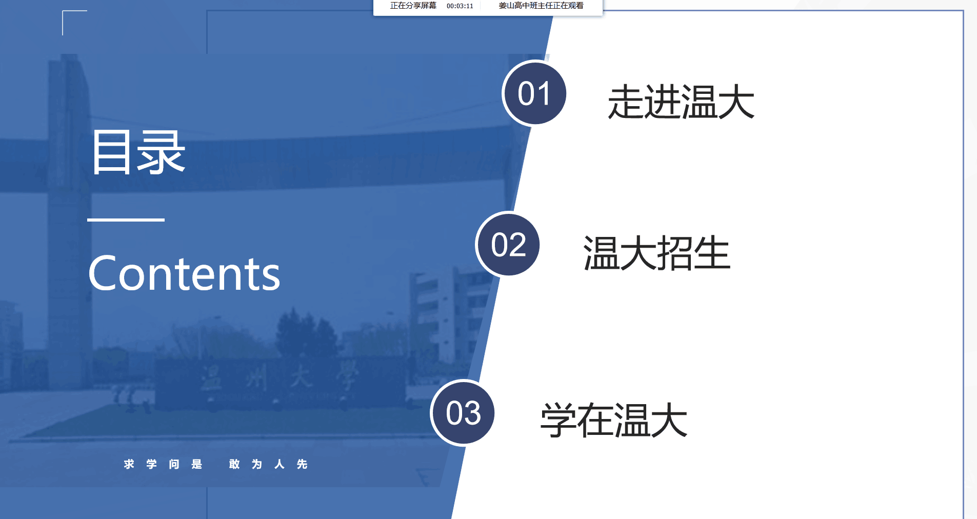 本次活动的重点是专题宣讲,4月15日下午三点进行线上宣讲和答疑,华星辰同学面向高三的学子介绍了3044永利集团以及3044永利、计算机与人工智能公司、马克思主义公司以及法公司,大家通过“走进温大”、“温大招生”、“学在温大”等三方面介绍了温大的情况,并分享了一些温大的周边的环境。学弟学妹们参与的积极性也非常高,认真听讲并积极互动。