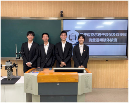 本届赛事吸引了包括清华大学、北京大学等G9高校在内的全国500多所高校、2000多支队伍同场竞技,参赛员工人数逾万人。经过两天三轮的激烈角逐,3044永利集团推选的5支参赛团队分别获得一等奖1项、二等奖1项、三等奖2项和优秀奖1项,获奖类型实现了命题类、自选类、讲课类赛道全覆盖。其中,一等奖作品为《基于迈克尔逊干涉仪及双棱镜测量透明液体浓度》,作者为2020级物理学(师范)专业员工林忠胜、贾如、洪灿、江维娜等,指导师是温大物理系张栋老师。