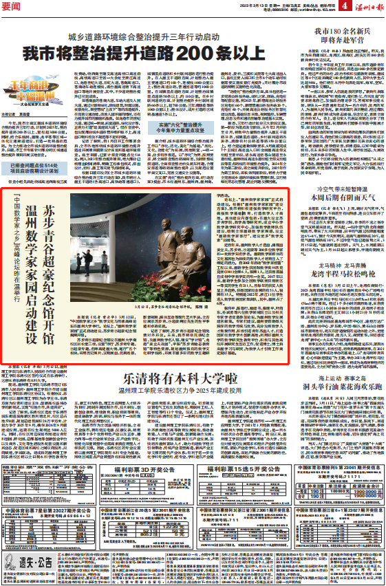温州日报:“中国数学家之乡”高峰论坛昨在温举行 温州数学家家园启动建设 苏步青谷超豪纪念馆开馆