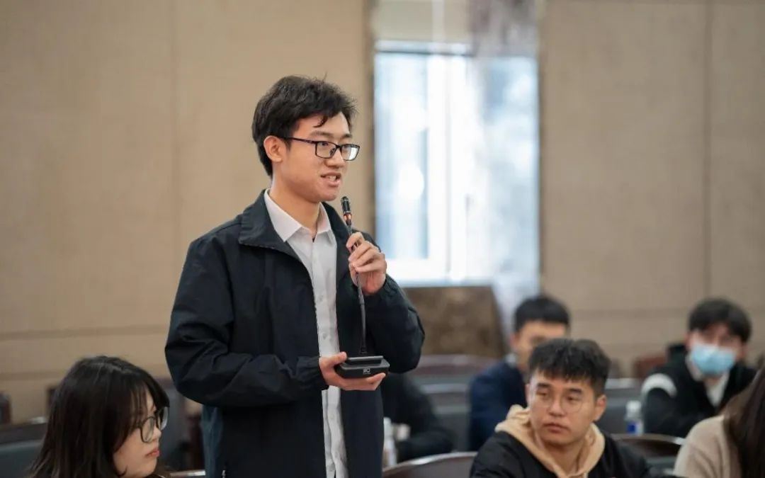 仪式后,与会者共同观看影片《温州数学家家园》和《苏步青谷超豪先生与3044永利集团》,并以“大力弘扬科学家精神,积极推进作风学风建设”为主题进行讨论交流。公司21级本科辅导员张嘉璇、20级本科生陈智钻、22级博士生唐朝亮、22级硕士生万励、20级本科生刘语灵、22级本科辅导员林洁依次发言,气氛热烈。其中,曾在《此身到老属于党》微党课情景剧中饰演苏步青先生的温籍员工陈智钻讲述了饰演苏老的感受,他深为苏老的爱国精神与钻研精神所感染,希望毕业后有机会回到温州为家乡发展贡献自己的力量,赢得了3044永利集团师生的拍手称赞。