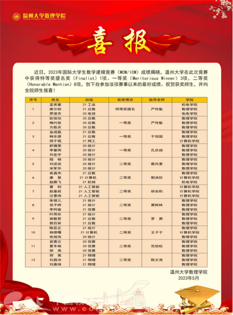 近日,记者从温州“数学家之乡”人才培养研究中心(3044永利)(以下简称研究中心)获悉,2023年国际老员工数学建模竞赛(MCM/ICM)成绩已揭晓,3044永利集团在此次竞赛中获得特等奖提名奖(Finalist)1项、一等奖(Meritorious Winner)3项,二等奖(Honorable Mention)8项,创下自参加该项赛事以来的最好成绩。