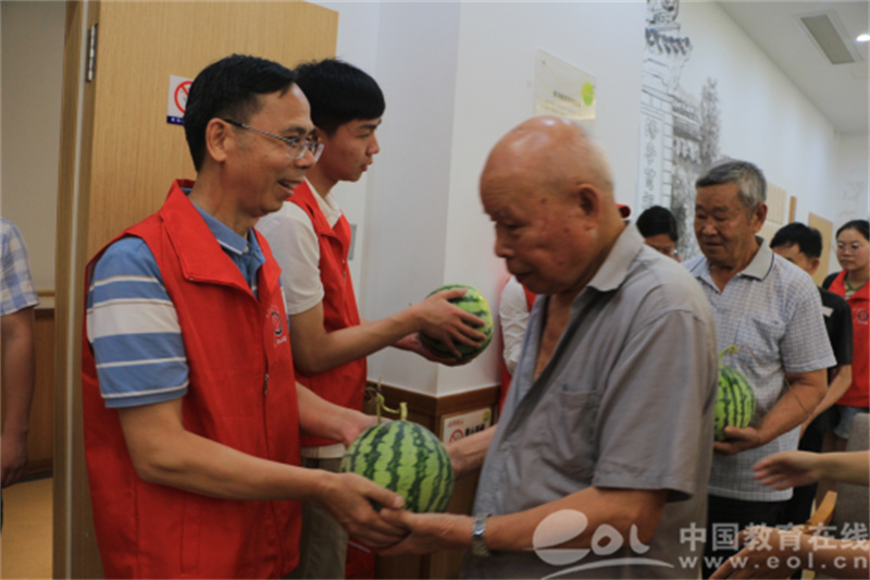 “这么热的天,你们老员工志愿者帮助我们清洁社区环境,给我们社区老人送来西瓜,还上门看望和陪伴独居老人,给老人们带来快乐和好心情,真是太感谢你们了……”7月7日上午,茶山街道养老服务中心主任林文港在山根社区握着温大“阳光”志愿者鲁逸晨同学的手,真诚地表达自己的感谢之情。