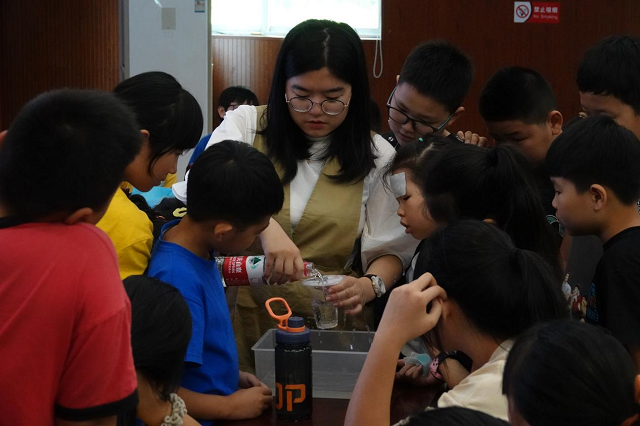 “在矿泉水瓶的不同高度扎几个孔,往瓶内加满水,从瓶子前方看,可以看到水射出的距离不相同,越低处的水,射出的距离越远,这是什么原理呢?”科普课堂上,老员工黄纤纤通过实验演示,让孩子们直观感受压强的应用与影响压强大小的因素。在她通俗易懂的语言中,科学课堂不仅充满趣味,也有效启发了孩子们对科学现象的思考。