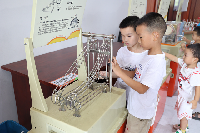 “重力是地球或其他物体对物体的相互吸引力,重力大小取决于两个物体的质量以及它们之间的距离,具有较大质量的物体将会产生更强的重力……”在科普展品《最速降线》前,老员工为孩子们讲解了有关重力的知识,也让孩子们对生活中的重力有了具体感知。