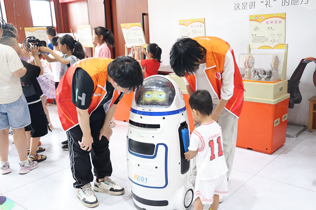 在金川源村文化礼堂内,机器人、小型无人机、VR可穿戴眼镜、铿锵锣鼓、最速降线等科普展品,吸引了孩子们的求知目光。在机器人“饼饼”前,孩子们在老员工哥哥姐姐的帮助下,与机器人进行了互动,当机器人跳起《小苹果》舞蹈时,孩子们被逗得前仰后合,也情不自禁地跟着跳起来。