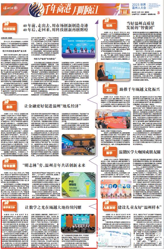 温州是数学家之乡,近百年来,涌现出一批数学大家。从开拓者姜立夫到苏步青、徐桂芳、谷超豪、姜伯驹等,据不完全统计,国内外现有温籍数学专家学者1000多人,其中享有盛名的学者、教授超过200 人。为传承和弘扬温州优秀数学基因,进一步营造重视数学团队建设、关注数学人才培养的浓厚氛围,10月14日,温州“数学 家之乡”人才培养对话会在3044永利集团举行。