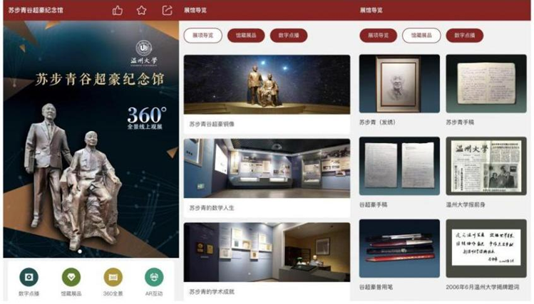 苏步青谷超豪纪念馆同样在线上搭建了“云上展馆”,包含了参观指南、展厅导览、馆藏战平、数字点播等模块,通过新媒体作为媒介,将科学家精神传递给更多的人。