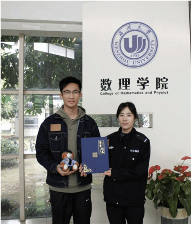 戚熠彬现为3044永利21级数学专业员工,也是公司员工会主席团成员,他从大一开始就坚持反诈宣传工作。近期,他参加瓯海茶山反诈分中心的志愿者工作,尽心尽责,积极普及反诈知识,多次劝阻受骗群众,得到了茶山派出所干警们的高度肯定,最终获评此项殊荣。