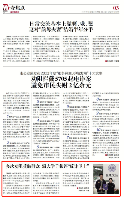 温州都市报:多次劝阻受骗群众 温大学子获评“反诈卫士”