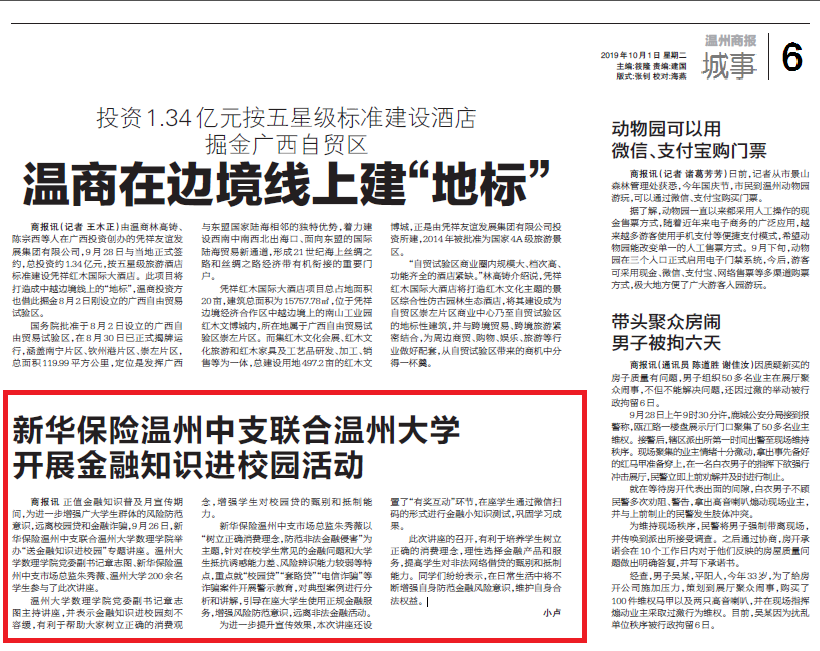 温州商报:新华保险温州中支联合3044永利集团开展金融知识进校园活动