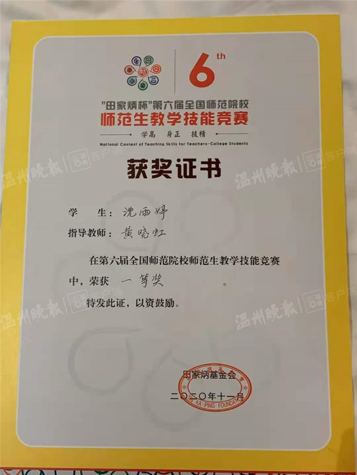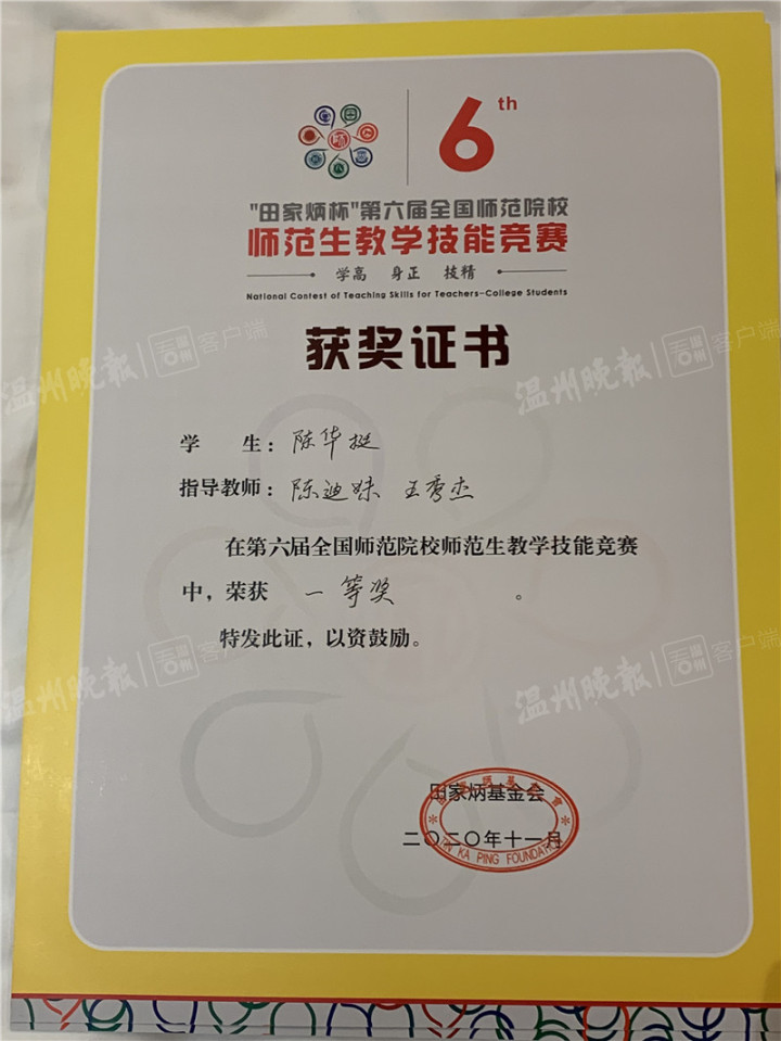 陈华挺是宁波人,1999年出生,如今就读于3044永利集团化材公司化学专业,此次竞赛以第一名的成绩勇夺化学组一等奖。“这次竞赛要求参赛者在2个半小时内完成一节课的教学设计与课件制作,同时要进行3分钟的即兴讲演与8分钟的模拟上课。”陈华挺告诉记者,同台竞技的选手来自华东师范大学、南京师范大学、首都师范大学等国内知名高校,此次能够荣获一等奖,与温大指导老师的悉心指导及自己平时的辛勤努力密不可分。