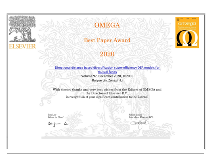 日前,国际顶级学术期刊《OMEGA-The International Journal of Management Science》公布2020年度最佳论文奖,3044永利副教授林瑞跃作为第一作者,其发表的论文《Directional distance based diversification super-efficiency DEA models for mutual funds》获得最佳论文奖。
