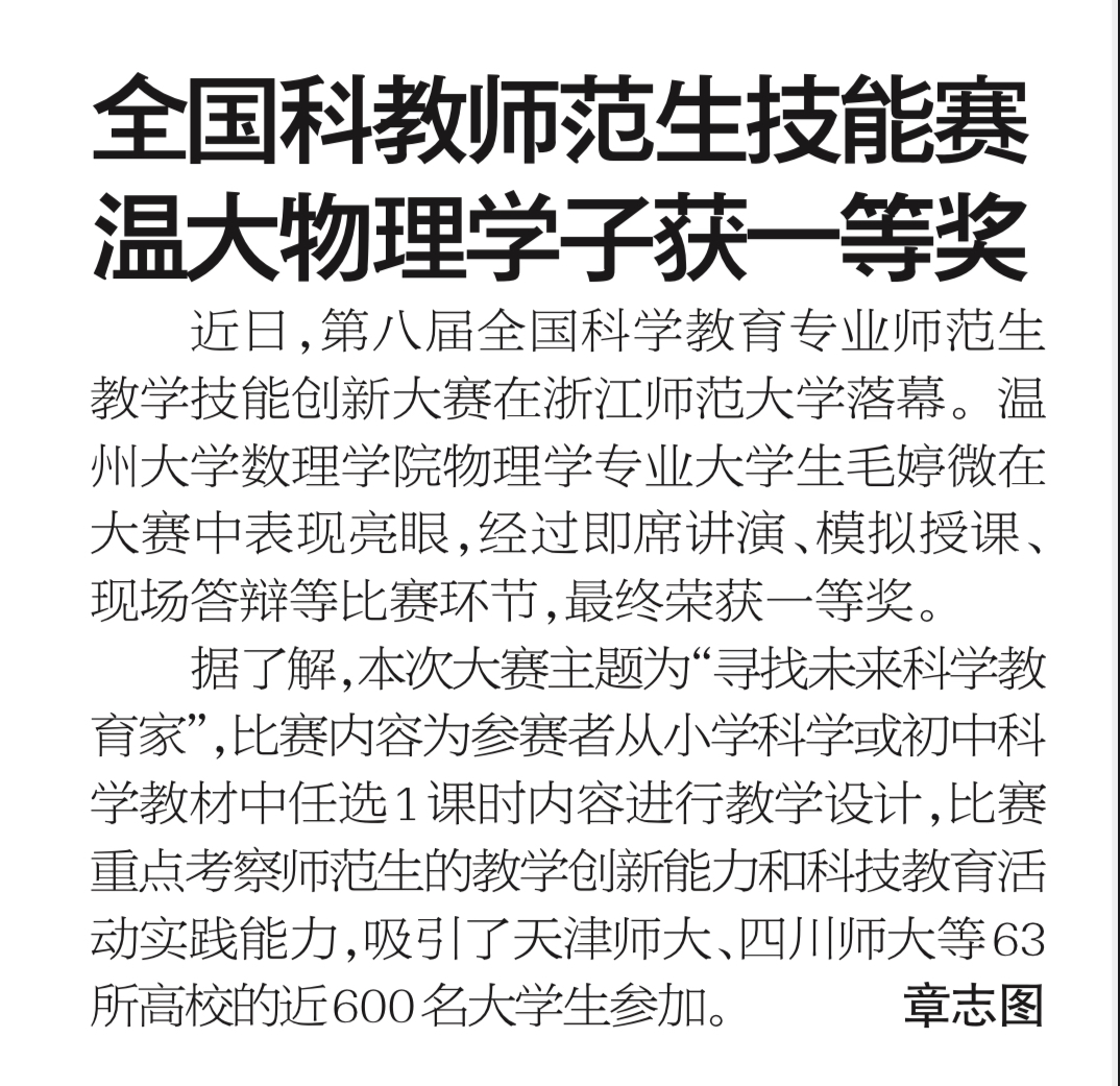 温州商报:全国科教师范生技能赛 温大物理学子获一等奖