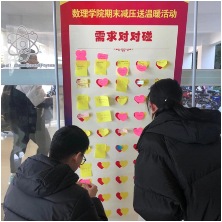 18应数2班小黄同学是“期末需求对对碰”服务的受益者,她的考前心愿是“实变函数怎么学,求许铭修大佬”,原本以为是写写好玩的,没想到真的得到了回应和帮助,这让她异常激动,考试信心陡增。19物理的小方同学则是“考试能量加油站”的受益者,由于对数学分析和高等代数两门课程考试信心不足,他提出了缓考申请。拿到员工的申请后,教务科张芬老师对他进行了激励和心理支持,最终,在老师的鼓励下,他收回了缓考申请,如期参加了考试,并顺利通过了这两门考试。