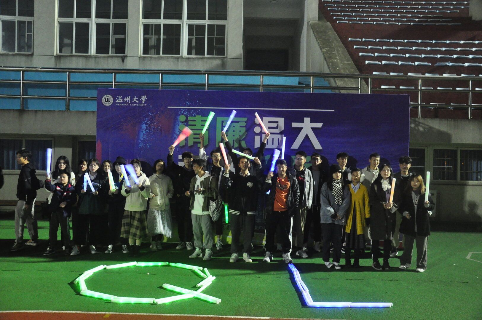 廉政知行社是挂靠公司管理的一个员工社团。本次夜跑活动以“清廉温大”为主题,也得到了公司数学建模协会、数学协会、蒲公英成长社等员工社团的积极支持与协助。活动中,同学们还在操场摆出“QL”的字母造型,寓意对廉洁品质的追求。
