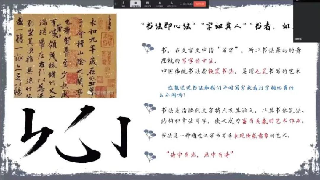 第三节课是书法课,老师从书法的含义讲起。引入王羲之《兰亭序》中的21个“之”字,将书法与我们平常打字和写字相对比,让书法这个看似高大上的词语更加生活化。接下来是对书体的介绍,从早期书体到后期书法艺术,让员工对书法有了更深的认识。同学们还学习了握毛笔的方法,并且观看了名家现场写书法的视频。同时老师还展示了自己的书法作品,鼓励同学们通过学习书法来修身养性、陶冶情操。