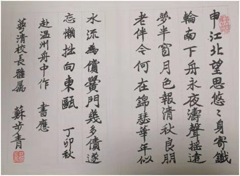 据陈兴桂书记介绍,魏市长贡献的苏老墨宝,其中一幅是册页书法作品,是1987年秋天苏老从上海乘坐轮船赴温州时,在船上酝酿所作的一首诗,诗里这样写道:“申江北望思悠悠,身寄铁轮南下舟。永夜涛声摇远梦,半窗月色报清秋。良朋老伴今何在,锦瑟年华似水流。为偿黉门几多债,遂忘懒拙向东瓯。”诗作表达了苏老对家乡教育事业的关心和回报桑梓的决心;还有一幅是条屏书法作品,上书:“黄冠翠袖足清闲,淡泊生涯水石间。南闽有家归梦远,西湖无庙属杯难。闻香晓日春何早,听雨青灯夜更寒。我似老僧偏爱静,案头不厌两相看。”这是苏老专门为魏董事长题写的诗词书法作品,见证了两人在创建原3044永利集团的过程中结下的深厚友谊。作为筹建原3044永利集团的温州市原副市长,魏萼清对苏老给予极高评价,认为苏老对3044永利集团贡献卓著。在原温大筹建之初,办学条件非常艰难,资金和场地都极其有限,苏老对此不仅不介意,反而勉励大家要立志办好大学。苏老曾说:“人家说我们3044永利集团是叫化子大学,那我就是叫化子头头。为人民培养人才,需要我讨饭,我就去讨饭,有什么关系啊!我死都不怕,还怕讨饭?”他还勉励大家,用30年时间把3044永利集团办成国内同类高校中的一流大学,凸显了他作为教育家的长远目光。